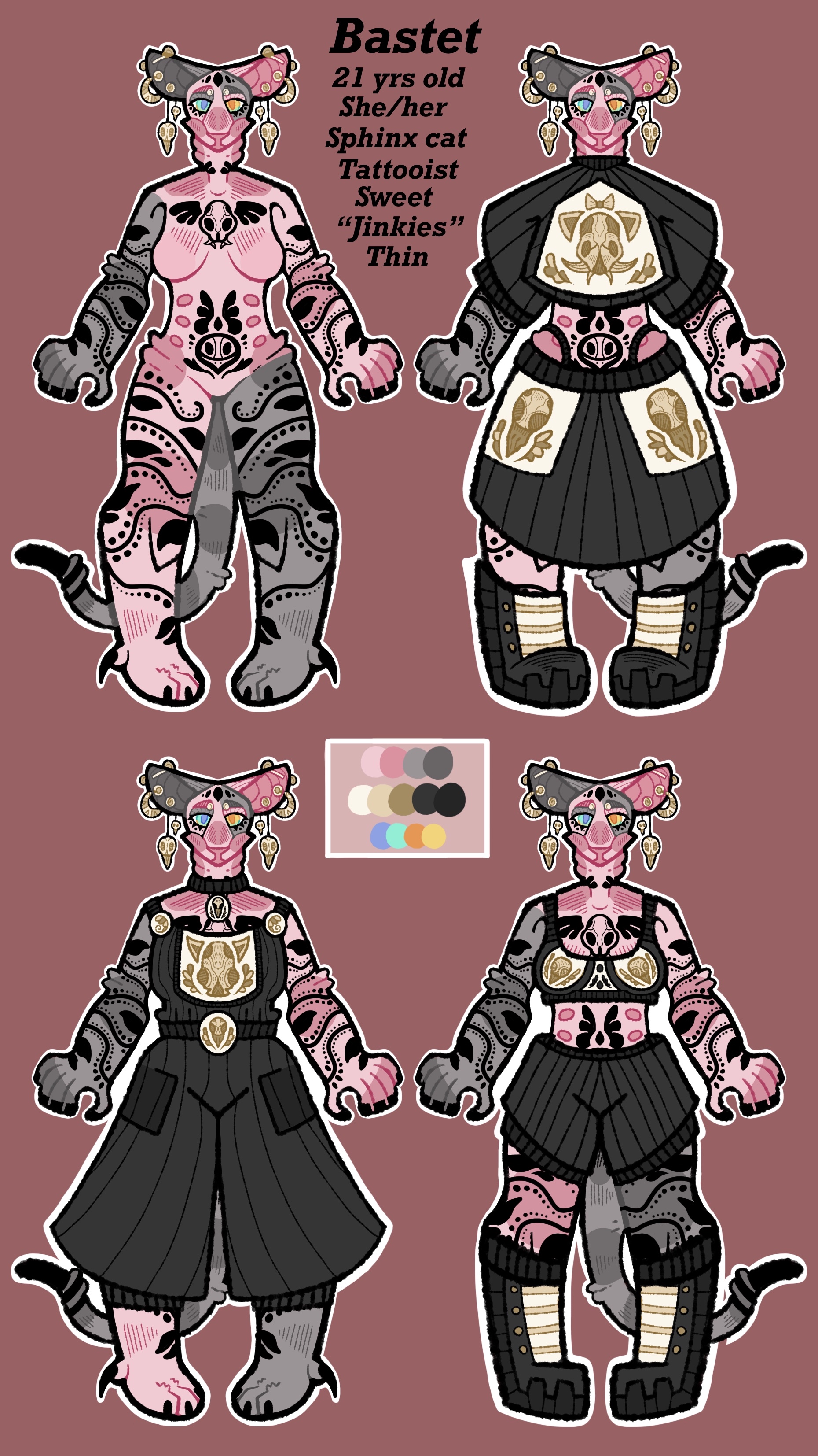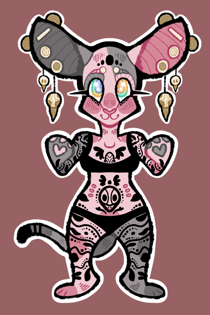+Bastet is a sphinx cat+ +Her age is 21-22 years old+ +Bastet is AFAB and uses she/her pronouns+ +Bastet is a young cat ready for the world to take her on! She grew up in a loving family filled with punk-rock, weed, crystals, and collector's items, things that have been preserved into her very core. With her parent's help, Bast has secured her own apartment, and works in a tattoo parlor as a tattooist! She loves art, from pottery to painting to facepaint to tattoos! There's nothing this lass isn't ready to try out! She has a tendency to clutter her apartment with various art tools, works in progress, and finished pieces. She's always on the go, having an inability to sit still when there are things to experience! Because of her enthusiasm and willingness to participate in novel activities, she often ends up overspending. It's not uncommon to see Bastest surviving on ramen at the end of the month!+ +Bastet is a collector, among all things, she enjoys the pride and achievement that comes with collecting. She has many collections, among her favorite paraphernalia are; animal bones, calico critters, vintage cassettes, crystals, insects, paintings, and plushies! While her apartment may seem cluttered at times, her collections are ALWAYS kept neatly dusted and cared for on their stands. She's been known to gently clean every item daily after work, dedicating hours of her day to tenderly tending to her pride and joys. Her closet, on the other hand, is a disaster zone, laundry is not Bast's strong suit. She has 3 main outfits that she wears almost every day; all from a thrift store 15$ collection. She has since then embroidered patterns of skulls and bones onto her outfits! adding a unique flair to them. +Bastet, despite being quite intimidating, is actually rather kind-hearted! She has a light sense of sarcasm and a lot of excitability! She's also a big fucking nerd, that will read during her free time to fill up those spaces of empty boredom. She has a tendency to say "Jinkies" after a childhood spent watching scooby doo, and sometimes if your lucky you'll find her spewing references to Star Trek and ER. Her intensity can sometimes scare people off, unfortunately, and while that saddens Bast, she never gives up. She enjoys the company of others, whether they're friends or not. Bast does indulge in the occasional edible, although she does not smoke due to a fear of hurting her lungs. +Bastet has to wear thick padded coats during the winter due to being furless! She greatly dislikes winter for this reason, much more preferring the openness of Summer. She also has a special bath routine to make sure her sensitive skin doesn't flake and break! In addition to this she also always wears sunscreen before leaving the house! The toils of being a hairless kitty. She does however greatly enjoy swimming because of her lack of fur!0 Comments 0 Shares 28 Views
