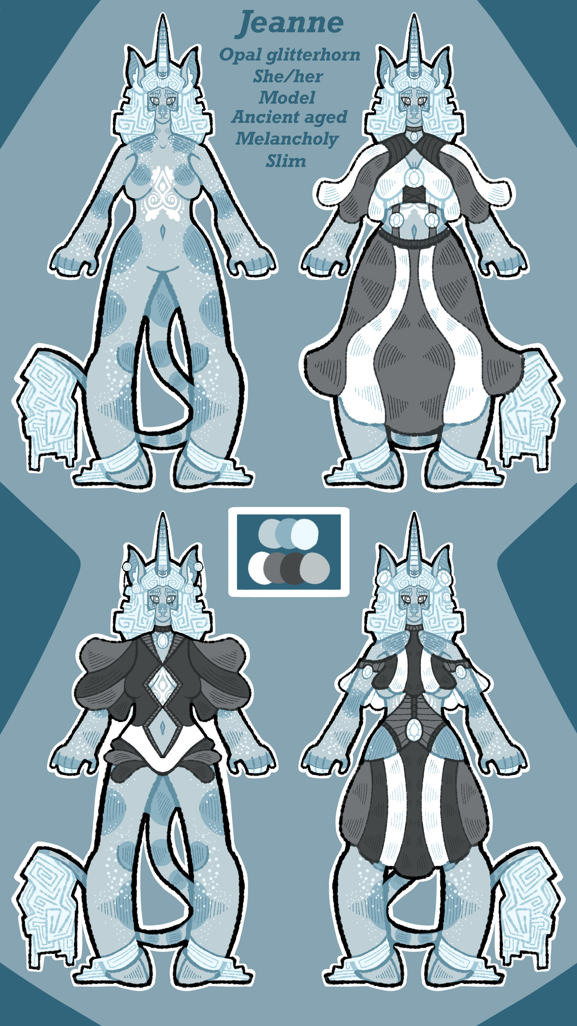 +Glitterhorns are an open species created by my friend GlitterTeacake or (Glitterteacake#7835) on discord!++Jeanne is a Glitterhorn Unicorn+ +Her Glitterhorn gem is milk-opal+ +Jeanne uses she/her pronouns and has an unlabeled sexuality.+ +She is based on D&D 5E+ +Jeanne is not a woman of laughter or joy, living for thousands of years has shown her the senseless violence that repeats itself in history over and over again. She was there as the moon first graced the Mindscape, and she'll be there till it eventually dies. She's a stern woman for that reason, a no-nonsense go-getter, while she may look young, she's anything but. She was born into a cozy glitterhorn family and enjoyed much of her youth. However, as she continued into adolescence, a horrifying war tore apart her country. That country in the current day no longer exists, and only she and a select few others remember it. She continues to collect history books to make sure the memory lives on; amounting to a massive private library; in which she allows others to come and go as they please. Over the millennia she's been alive, Jeanne has acquired massive wealth from various business dealings and modeling, making her somewhat of a powerful figure. She's hesitant to let anyone truly into her life, but she enjoys the surface-level company of others. +Jeanne is a collector of sorts! She enjoys collecting things of history, being quite historical herself! Teapots, silverware, and china spark a particular sense of love in her heart. She has countless shelves filled with dainty plates, pans, pots, cups, and dishes that'll never be used. Alongside enjoying teaware, she also enjoys tea itself! Earl Grey, pomegranate, chamomile, and cinnamon are among her favorites. She makes tea for all her guests, requested or not, rather that's not important to her. She doesn't mind if the tea is never touched, but the act of making tea for her guests must always be upheld, a ceremony of sorts. She tends to a small garden in which she grows her own tea herbs, caring for their tedious needs.+ +Despite her generally melancholy mood; Jeanne is not a mean woman. She acts kindly towards those who request her help and enjoys donating her time, effort, and money to better her community. She's very closed off regarding her history, but she won't hesitate to listen to those who need it. Jeanne is a kind soul at heart, her roughness coming from layers of rock built around her heart; a thing hard to avoid when you've lived as long as she has. Still, she enjoys personal company once in a while; especially if they show an interest in her vast collections of books and silverware. Those who have seen Jeanne's low-hanging smile are honored to have received it, and a sure sign that you've made a friend in her.+ +Jeanne, like many Glitterhorns, has the impeccable power of healing magicks. Her longhorn and centuries of life have led her to be immensely capable in the art of medicinal magic, repairing grievous wounds with enough time and concentration. In the most dire of consequences, she may even break off chunks of her horn to harness her most potent magical energy. She also uses her magical ability to imbue items with mild healing properties! Mostly towards her homebrewed tea.+ +Glitterhorns are an open species created by my friend GlitterTeacake or (Glitterteacake#7835) on discord!+0 Comments 0 Shares 30 Views -