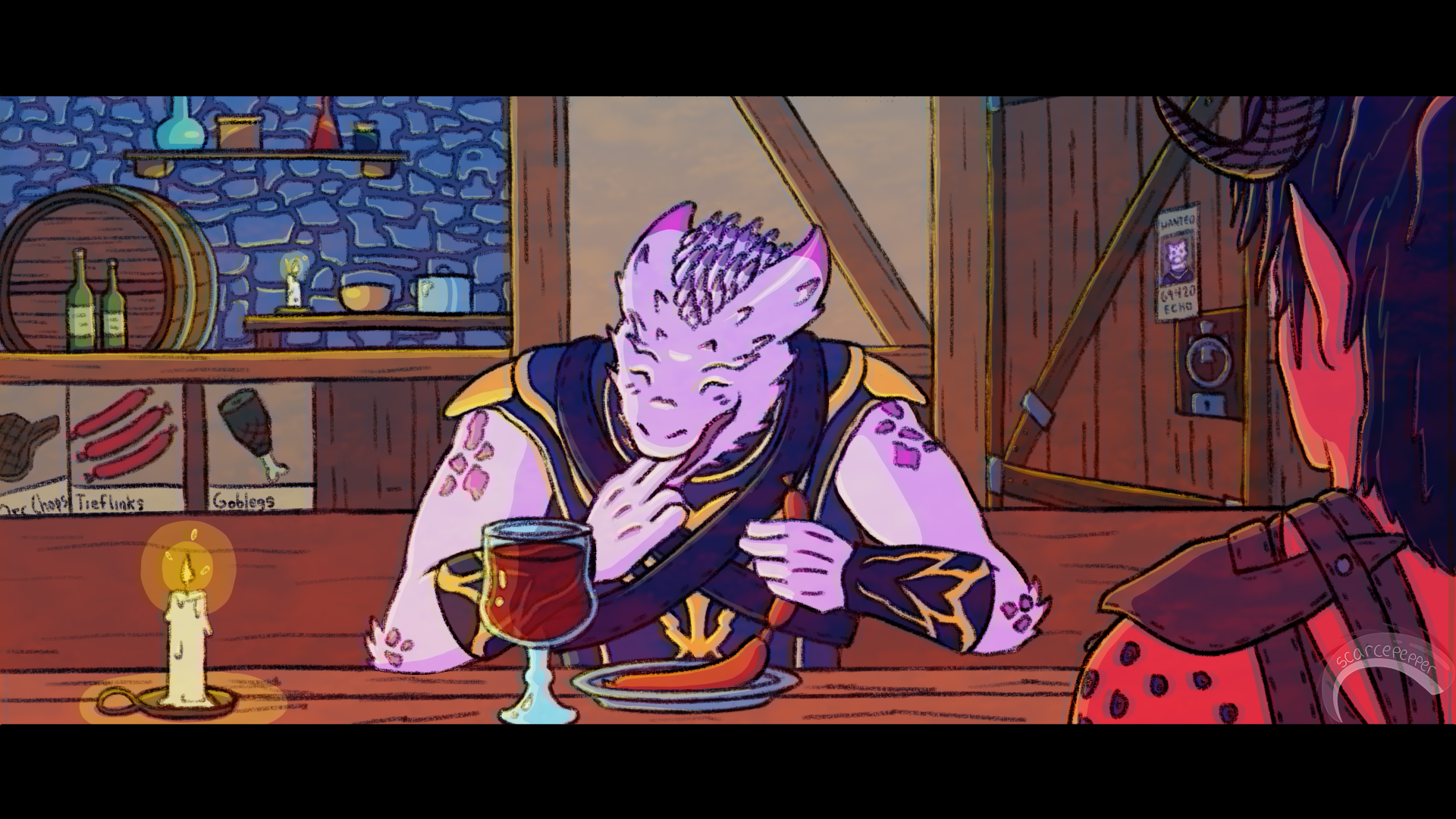 This is my submission for Artistree's Art Swap Event for August 2023. The theme was "Scene," and this time I mashed together that one burger meme from Spider-man: Into the Spider-verse and my Tav, Echo, as The Dark Urge from Baldur's Gate 3. I had a lot of fun doing this one trying to be creative with the designs, puns, and meme while also trying to stay mostly true to the composition. I even had a go with that color aberration effect that Spider-verse uses.