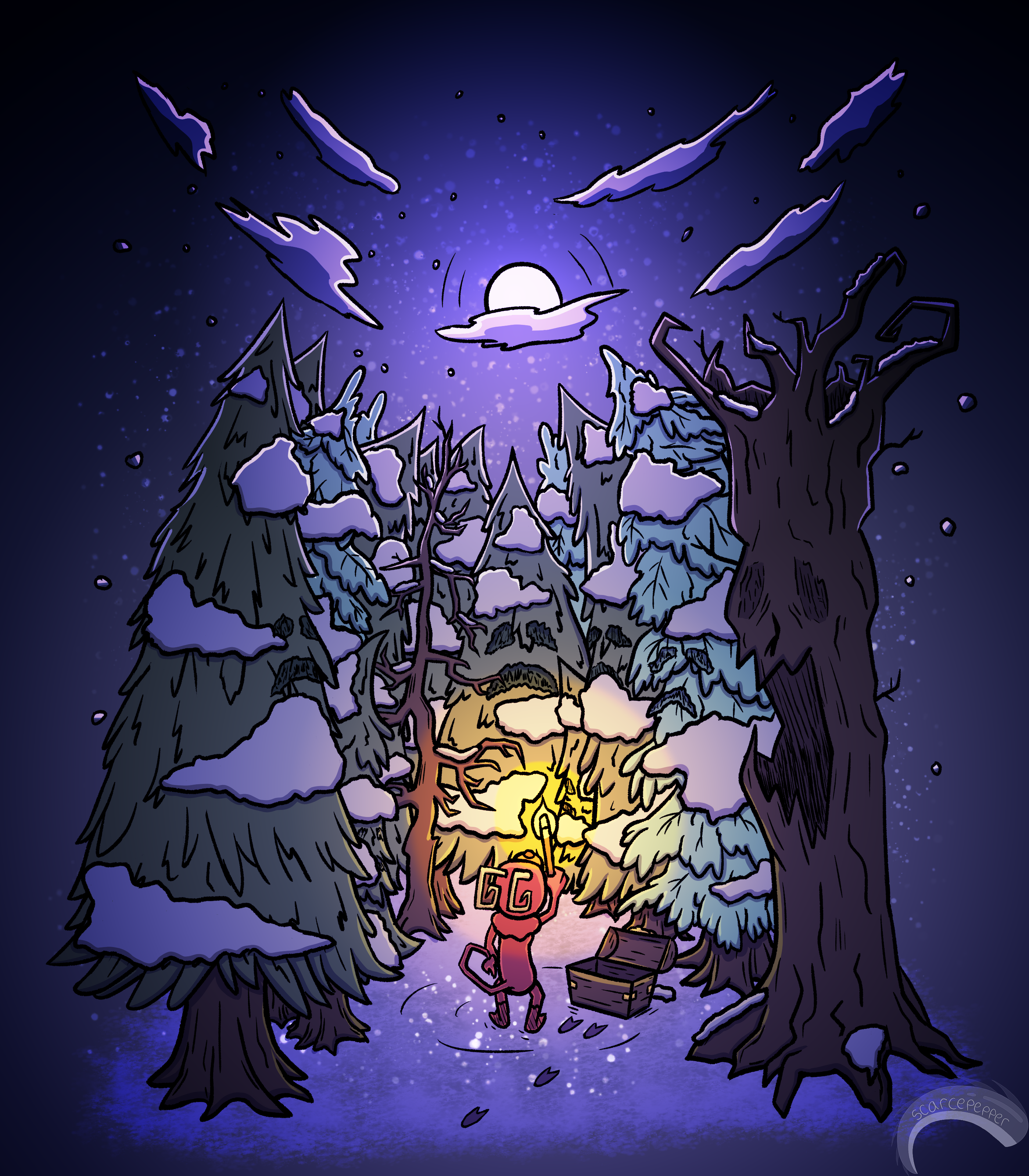 Made art inspired by highintheautumnsky's music, Shady Woods, and my submission for Artistree's Art Swap Event for December 2023 for the theme "Winter". This piece continues on Klei's game, Don't Starve/Don't Starve Together, during winter season.