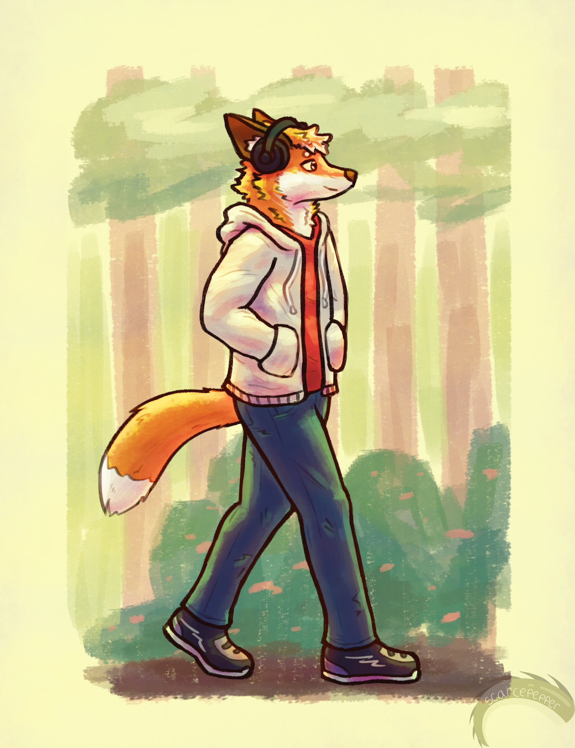 My first attack for Art Fight 2025 of Fossils vs Crystals featuring LP's lil' fox guy on a lil' walk vibin' to music