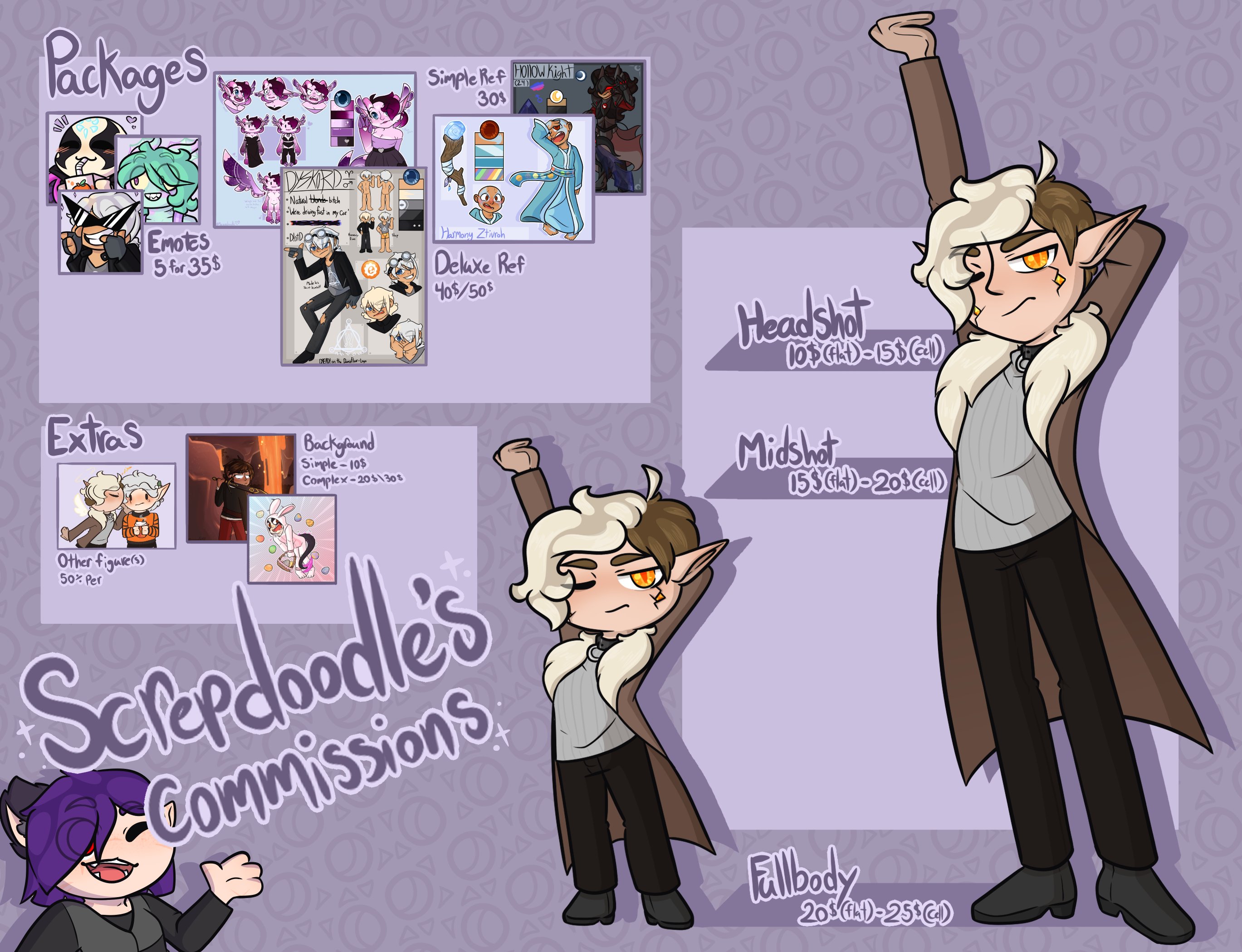 If you have any questions, please don't hesitate to ask!After much deliberation (and stalling way too much on drawing this out) I've decided my current skills no longer match my old commission prices. So I've decided to alter them a little. I hope you guys understand :3 ------ **[Regular Style]** * Full - $55 flat color, $65 cell shaded * Mid - $35 flat color, $45 cell shaded * Bust - $25 flat color, $30 cell shaded **[Chibi Style]** _35% off corresponding 'regular style' tiers_ * Full - $35 flat color, $42 cell shaded * Mid - $23 flat color, $29 cell shaded * Bust - $16 flat color, $20 cell shaded **[Extras and Details]** _These apply to packages as well_ * Complicated Designs/Shading/Composition - upwards of double the base price * Other figure(s) - 50% of original price (per figure added) * Background - $5 simple, $15 pattern, $40/$60 complex * Alt Versions - 50% to 75% of original price (depending on complexity) * Deadline/Rush Fee - upwards of double the original price For more details, packages, annual sales, and my ToS, please check the commissions section of my [carrd](https://screpdoodle.carrd.co). If you have any questions, please don't hesitate to ask!0 Comments 0 Shares 54 Views -