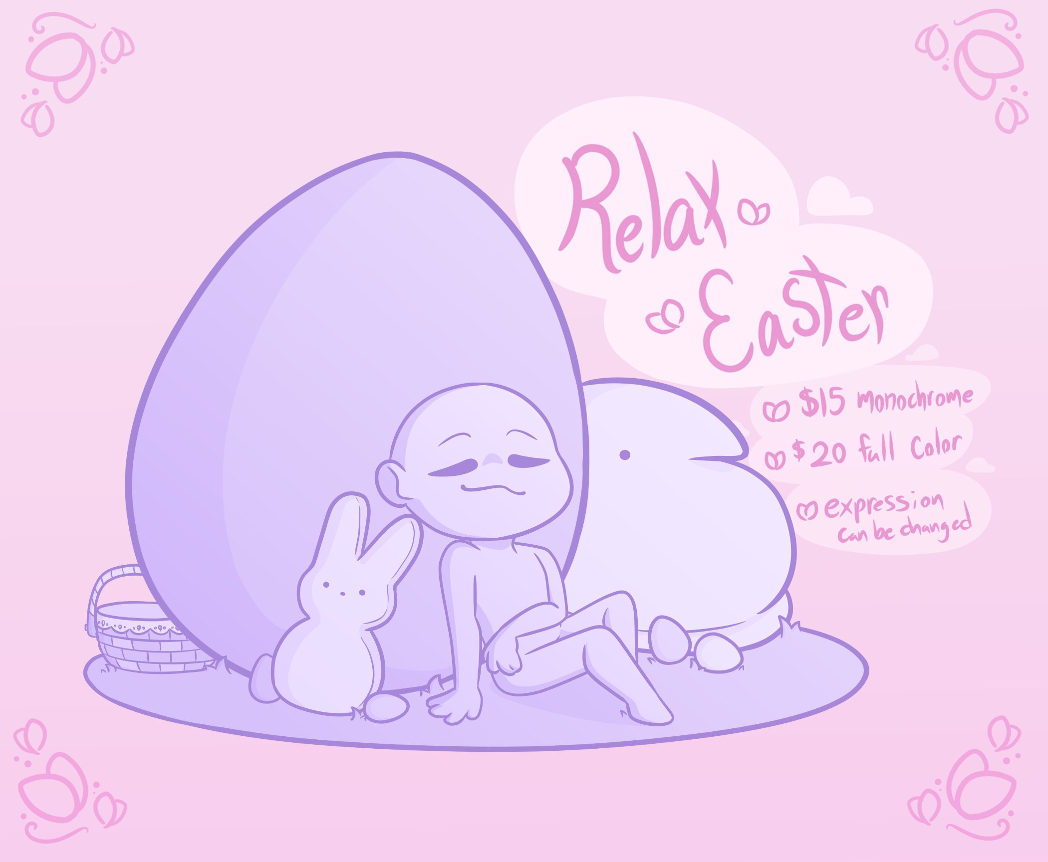 Decided to bring it back for this new account for the holiday season, so if anyone's interested, feel free to comment or DM me!Here's one of my older, ~~uncreatively named~~ YCHS, 'Relax Easter'! I tend to get hit hard by the post holiday malaise, so to help it be more of a gradual decline and less of a plummet, I drew this last year Decided to bring it back for this new account for the holiday season, so if anyone's interested, feel free to comment or DM me!0 Comments 0 Shares 37 Views -