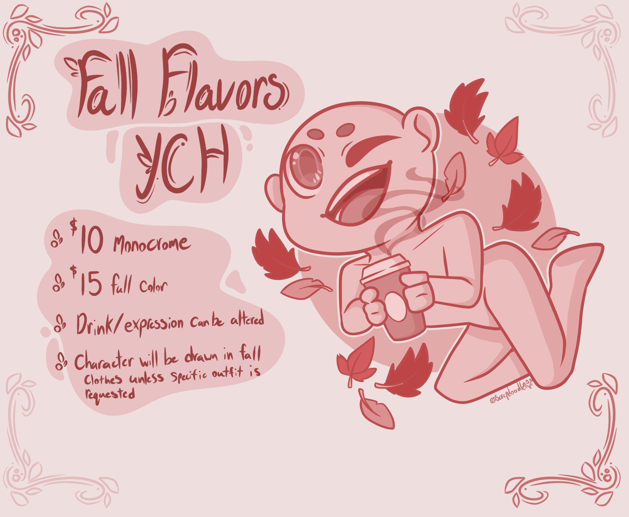 #YCH #openYCH #yourcharacterhere #fall #autumn #digitalart #opencommissionsDecided to post one of my older YCHs here, 'Fall Flavors', too, since I've uploaded all the other ones XD //Details// * Prices are in USD * Monochrome will be $10 and full color will be $15 * Expression and drink can be altered * Character will be drawn in fall clothes unless a specific outfit is requested #YCH #openYCH #yourcharacterhere #fall #autumn #digitalart #opencommissions0 Comments 0 Shares 64 Views