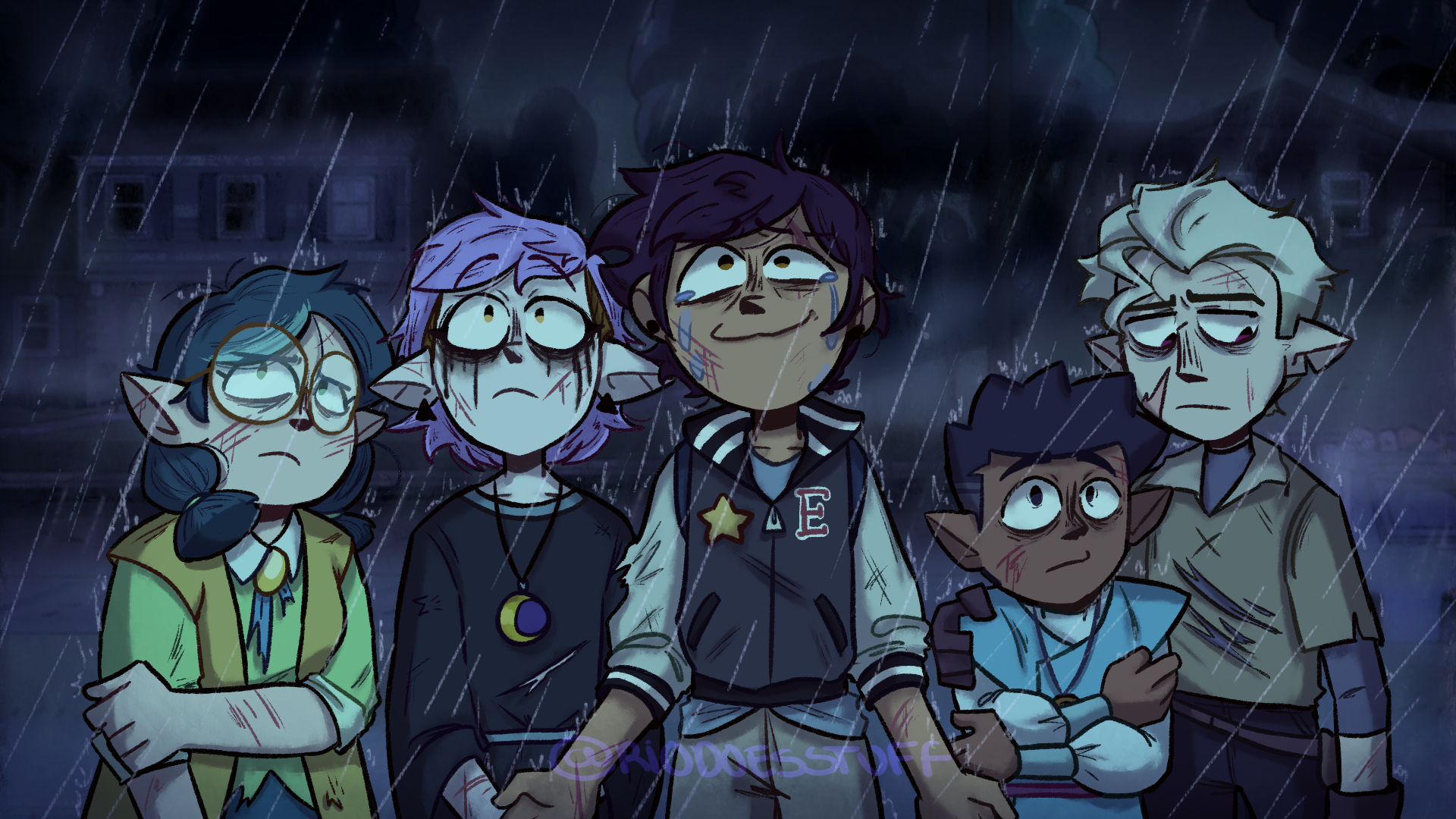 Characters: Willow Park, Amity Blight, Luz Noceda, Gus Porter, Hunter from "The Owl House" Screenshot redraw from S2b finale "Kings Tide"
