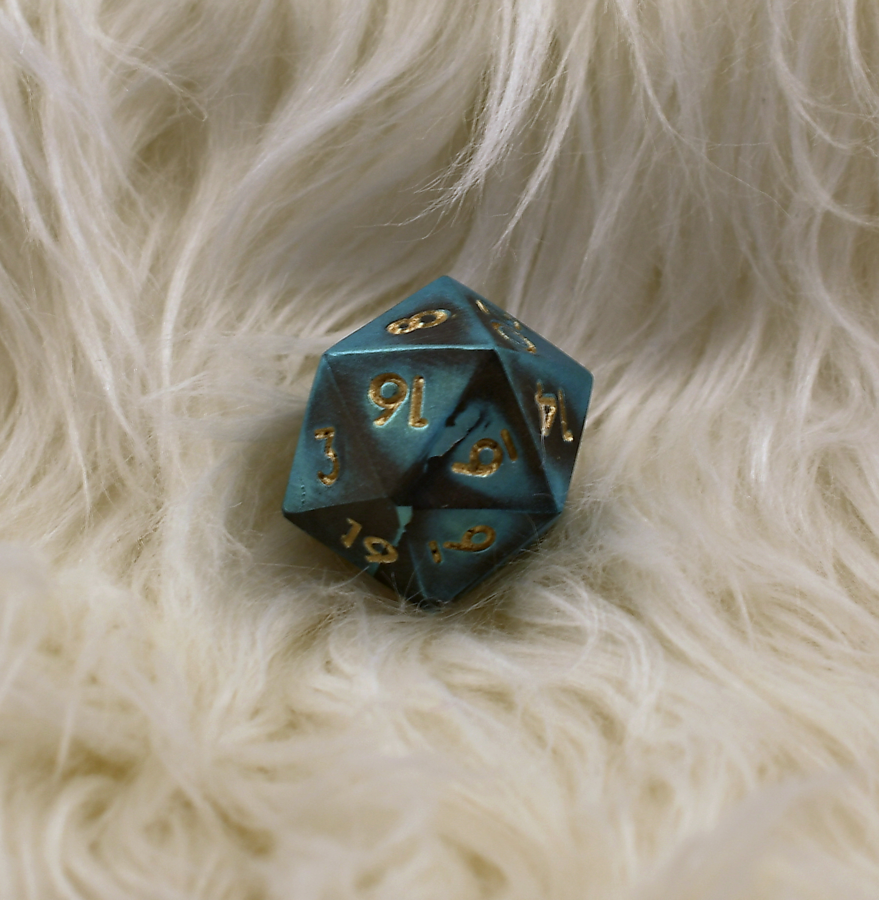 An experiment with blue mica powder and sanding to produce a matte d20. I like how it came out. Available here: https://ko-fi.com/s/612b697517 [ID: A blue and black matte resin d20, inked in gold and set against a backdrop of ivory faux fur. /ID]
