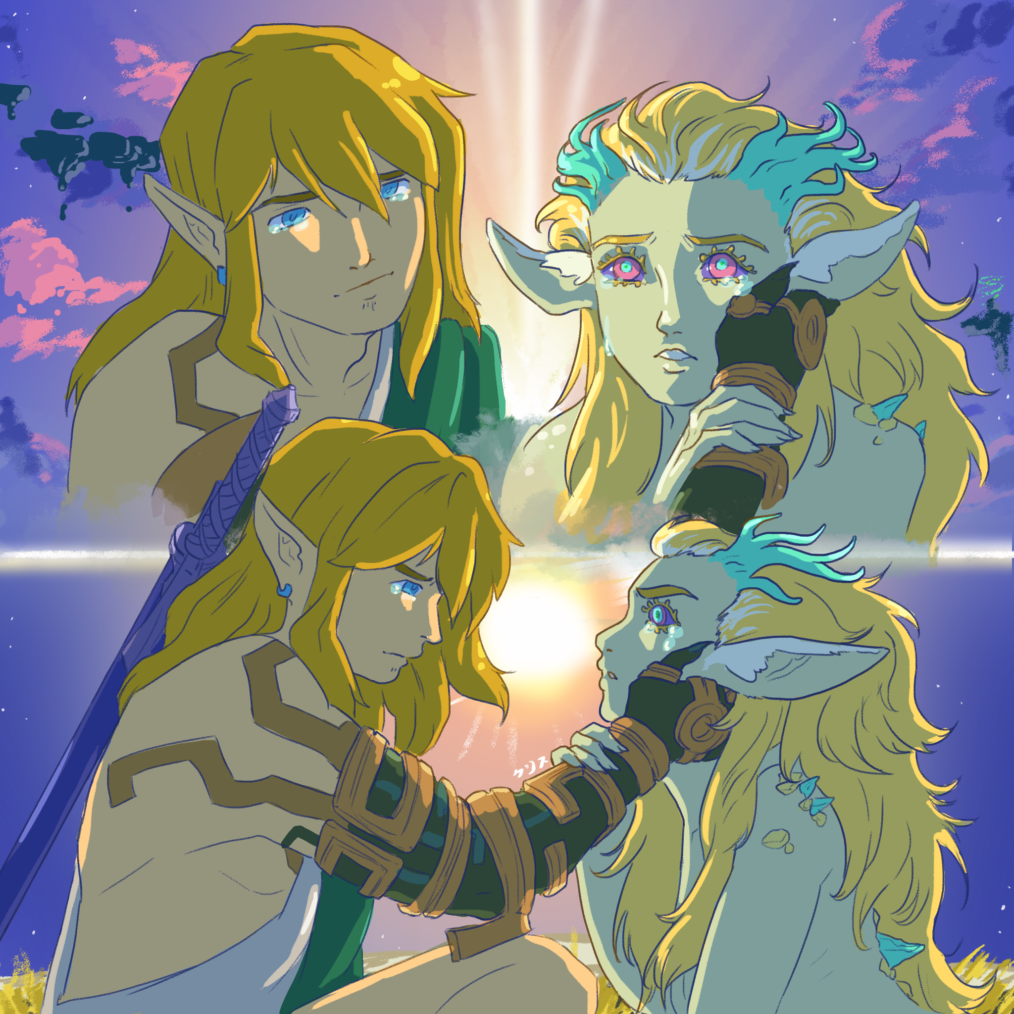 I'm not one for head cannons, but in this occasion I just had to. Link eventually finds a way to turn Zelda back to her former self, he finds her as she requested. She is although, changed, and keeps some dragon like traits. To be loved is to be changed. This scene is mirroring the one were Zelda is also found by Link in BOTW, you can see it in the first sketch . Now if you'll excuse me, I'm gonna go and finish the game to see how it actually ends, but with the comfort of these two finding each other again :')