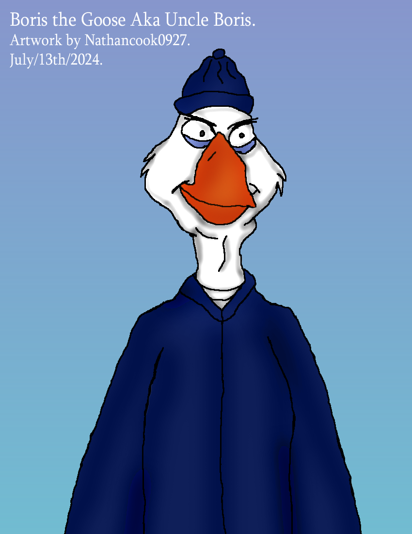 • Finally got to work on an Anthro Version of Boris Goose from Balto who had been taking care of Balto when he was a Pup, In my Version while Balto's Father is trying to Rescue his Mother from the Wolflantians, Young Balto was left in the Care of Boris the Goose who Young Balto called Uncle Boris, As Time Passed Balto had gotten older and Boris would end up taking in Muk & Luk the 2 little Polar Bears who drives him nuts while they called him Uncle Boris.
