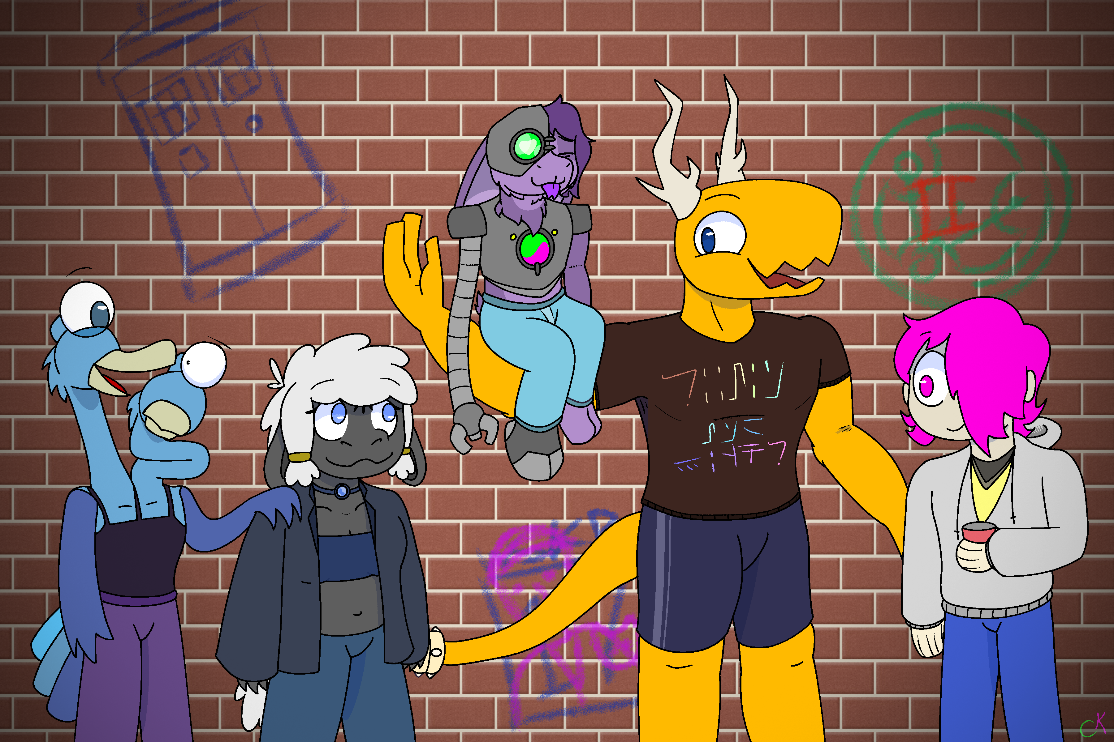 You know, part of the struggle of finding your feet on a new platform is finding out how to start. That being said, I gotta start at some point, and that point shall be now. Yo! I'm Cosmi. I'm queer as hell and I make art in many forms, such as this! Digital art! Music! And sometimes I do a little story writing and even voice acting on a few occasions! Not for any big projects generally, but Undertale But Really Really Fast still made its residual effect on my career. Soooooo now I'm here because there are like... no other good art posting platforms. DeviantArt took a bad turn down AI lane, Artstation is much too professional for my blood, and pretty much every social media has some form of algorithm, shadowban, shifting community guidelines maze, or some other system designed to wreck art-related stuff. So hi! I'm here now. Anyways, I drew this picture the other day with a bunch of OCs. They're a friend group. Here are there name from left to right, and a small factoid about each of them. From **LEFT to RIGHT**, we have: **Mira & Mico** (they/them for both heads) - 26 year-old, two-headed, single-brained birds with an interstellar delivery job. Somehow, Mico (the head on the right) ended up with all the service worker exhaustion. Mira's fine. **Peri** (she/her) - 24 year-old, wooly trans gal with a zest for exploring all the worlds out there. She wants to make an annotated star atlas. **Kyrie** (he/him) - 18 year-old short king who's just a small guy. A little fella. He's got a big extendo arm that can reach up to 30 feet (9 meters) and he practically has the world record for most chill individual. **Boris** (he/him) - 19 year-old strongman of the group who is actually just a big gay spacetruck/spaceship guy(??? whatever the space equivalent of a truck freak is). Best friends with Kyrie. **Gill** (he/him) - Probably in his 200's. yeah, this is where you all get blindsided by the fact that these guys are al technically fandom OCs because this fella? This guy? He's a Time Lord. get DW-blasted lmao