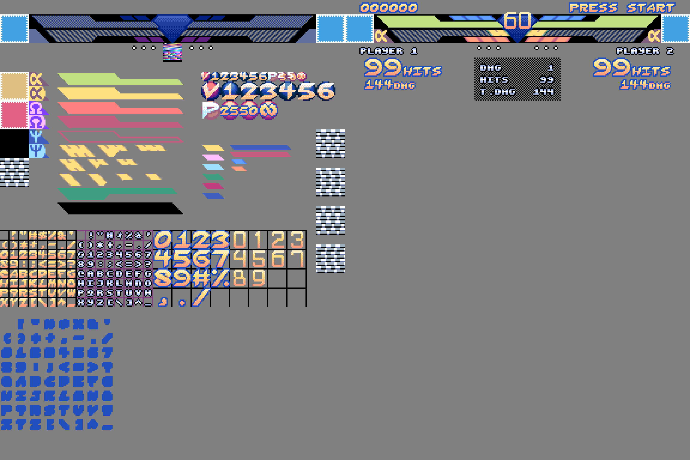 A fighting game HUD design I call "Dimensional Blitz" (sometimes "Dragon Ball Zim" in reference of my old crossovers from when I was 8). The HUD includes: * Player score * Character icon (changes color depending on dizzy level) * Character name * Life bar (long upper bar) * Power bar (long lower bar) * "Aura" icon ("auras" are similar to ISMs in Street Fighter Alpha 3 or Grooves in Capcom VS SNK 2) * Guard Meter (short upper bar) * Aggressive Meter (short lower bar) * Victory icons * Time limit * Combo hit and damage counters --- More about Auras: * Alpha: * * Standard ATK and DEF. * * Standard meter gain. * * More ATK and DEF on max power. * * More DEF on low health. * * 9-second "Advanced Mode" is activated manually, uses half the power meter, raises ATK and DEF, and moves consume timer instead. * Psi: * * Low ATK. * * High meter gain from attacking, no meter gain from being attacked. * * Supers are stronger, but more expensive. * * More meter gain from attacking when on low health. * * "Advanced Mode" doubles the power bar capacity when reaching the original limit, and Super cost is halved. Only goes away when power is below 50%. * Omega: * * High ATK and low DEF * * Low meter gain from attacking, high meter gain from being attacked. * * Supers are cheaper, but weaker. * * More ATK on low health. * * 18-second "Advanced Mode" is activated automatically when power meter is full. Raises ATK and Super strength, and the power meter acts as the timer (Super cost remains the same).