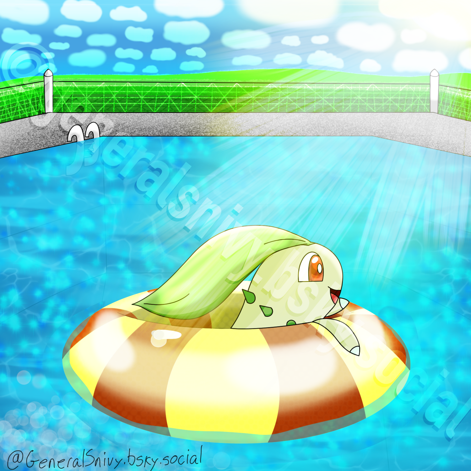 I haven't drawn a Chikorita in a long time, like 2 years too long if you ask me. Anyway, here's one swimming in a swimming pool in their cute, little inner tube as they bask in the summer sun as they swim around! For those worried that Chikorita will accidentally pop their inner tube due to the spikes around their neck, don't. The inner tube is made of a very strong material that makes it highly pop resistant and it's made to handle prickly Pokemon like Cacnea, Cacturne, and other prickly creatures without any issues. This was another fun one to put together as this was an idea that popped into my head a day after I was feeling creatively bankrupt. I'm proud of the fact that I was able to finish this in 2 days, given its simplicity, that makes sense. I really had a lot of fun applying the shading to everything here as I discovered that if I set the blending mode of a layer to Overlay and selected a pure black color, I can apply darker shading much faster vs using the Multiply blending mode and selecting each flat color individually. I think the same can apply for brighter shading, but I'm not 100% sure on that as of yet. Regardless, I had a great time drawing them and this discovery of using the color black on an Overlay blending mode layer will make things easier going forward!