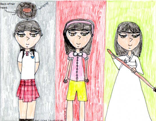 Appearance: Tall for her age, light skin, black hair to her shoulders with bangs and two strands being held with a brown barrette, and hazel eyes. Wears the uniform for school and on non school hours and weekends, a pink blouse with a white lace collar, light green green shorts, white socks, pink tennis shoes with white laces, a light pink headband. When in her grandfather's temple, an all white hanbok.