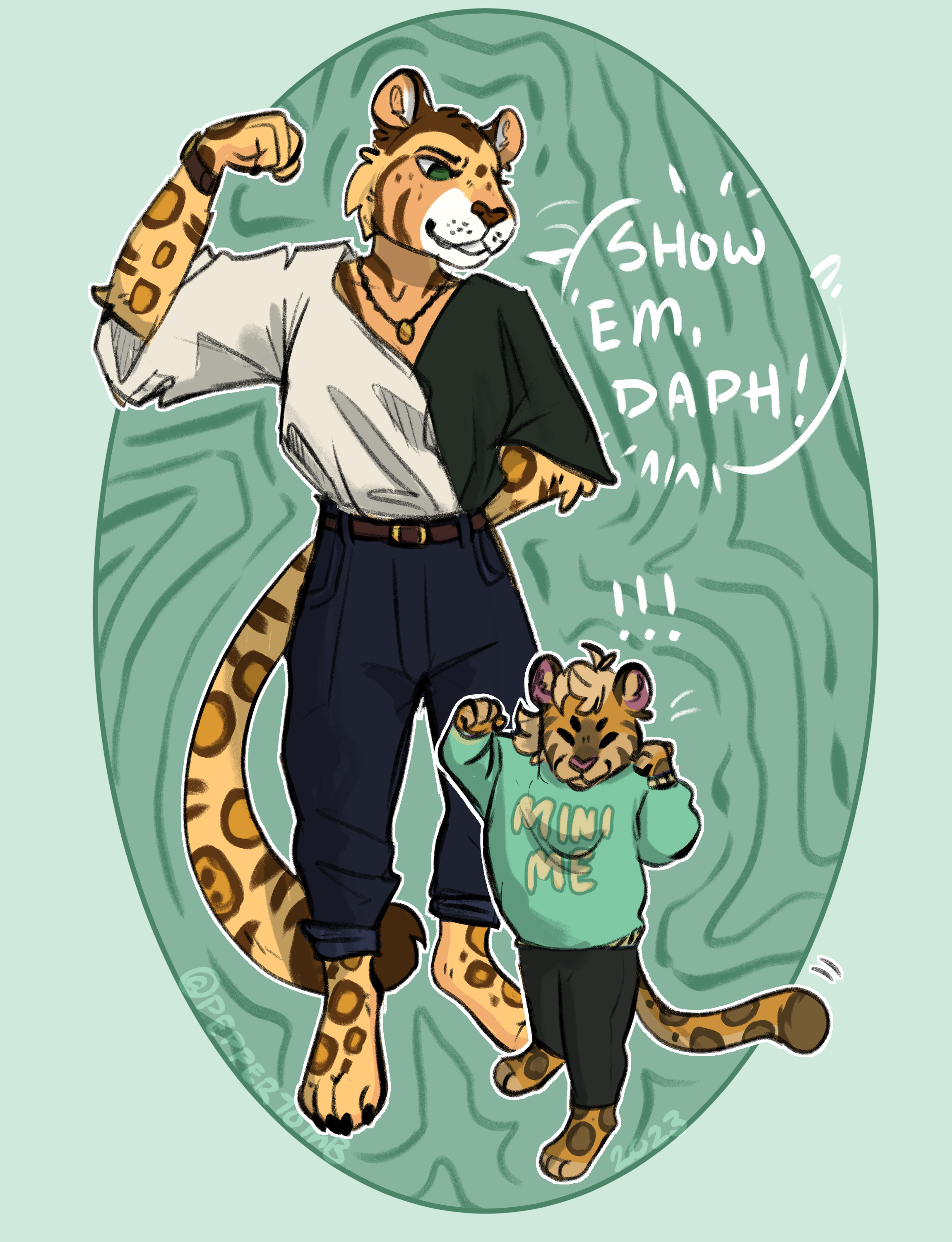 _"Show em your guns Daph!"_ --- Kia and their mini-me Daphne <3 Love drawing her scrunchy lil face. Kia uses they/them Daphne is a toddler and doesn't understand the concept of pronouns, but later in life she'll respond to any.
