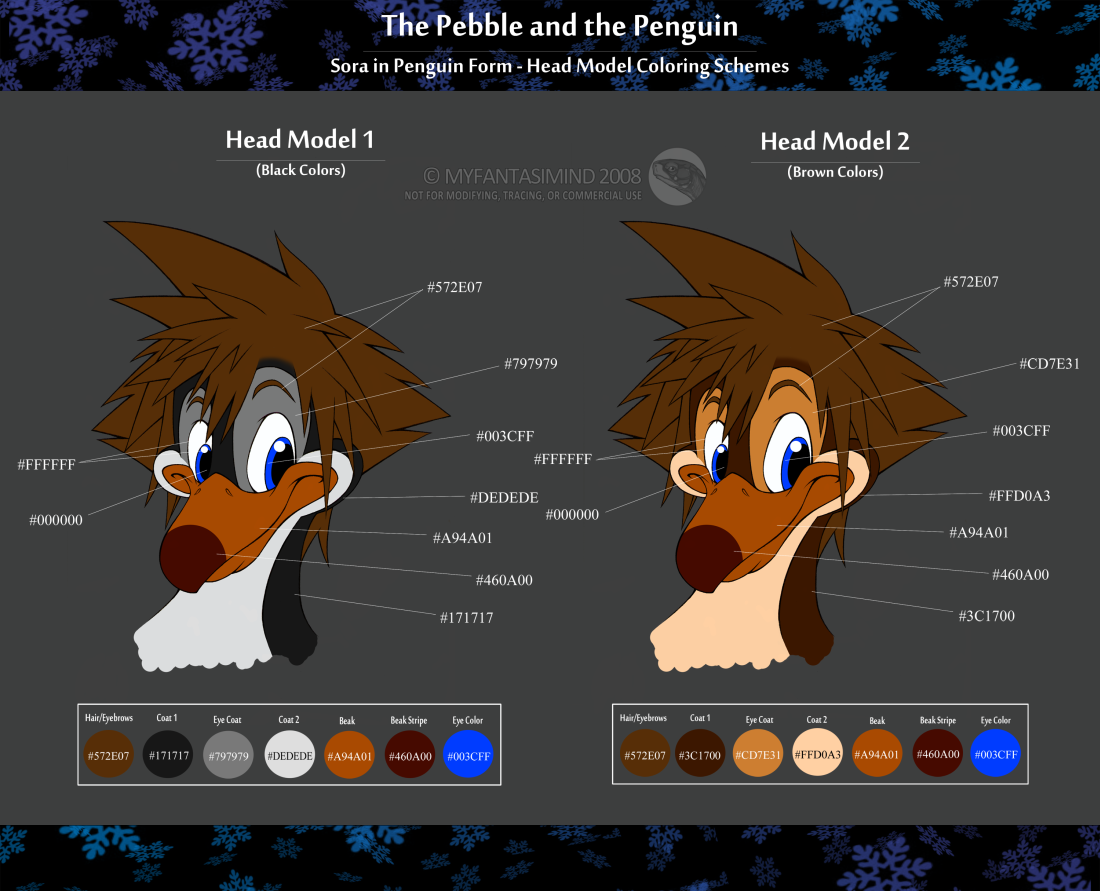 When I was into the idea of having Sora visit the world of The Pebble and the Penguin, I wanted to create him transformed into a penguin! Made a small color sheet for the two types of color schemes I chose for him. Enjoy! Kingdom Hearts © Square Enix -- The Pebble and the Penguin © Don Bluth -- Art © MyFantasiMind 2008