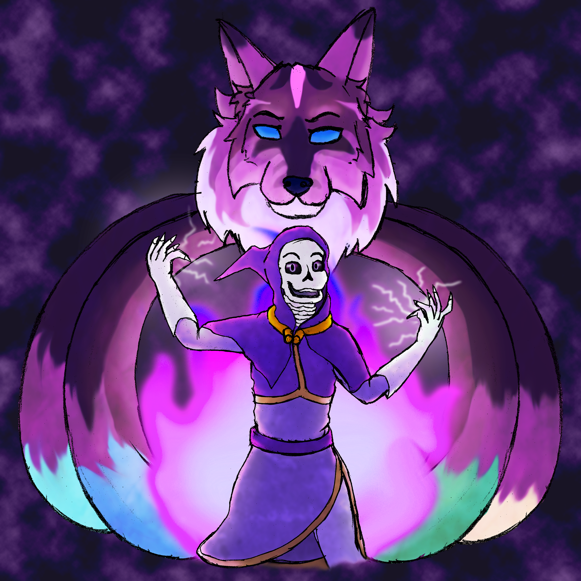 Neither the first, nor the last drawing I did of @gailleanarts characters in 2023. Artfight especially we were able to reach a chain level 18 drawings (and that is not counting the animated attack we did against one another separate from this chain). This piece is of Rae's character "Artemis" and my kitsune OC "Kindle". In the "World Hoppers" Dungeons and Dragons game we play, Artemis is a warlock with the overseer Kindle as her patron. I really wanted to do something depicting the two again.