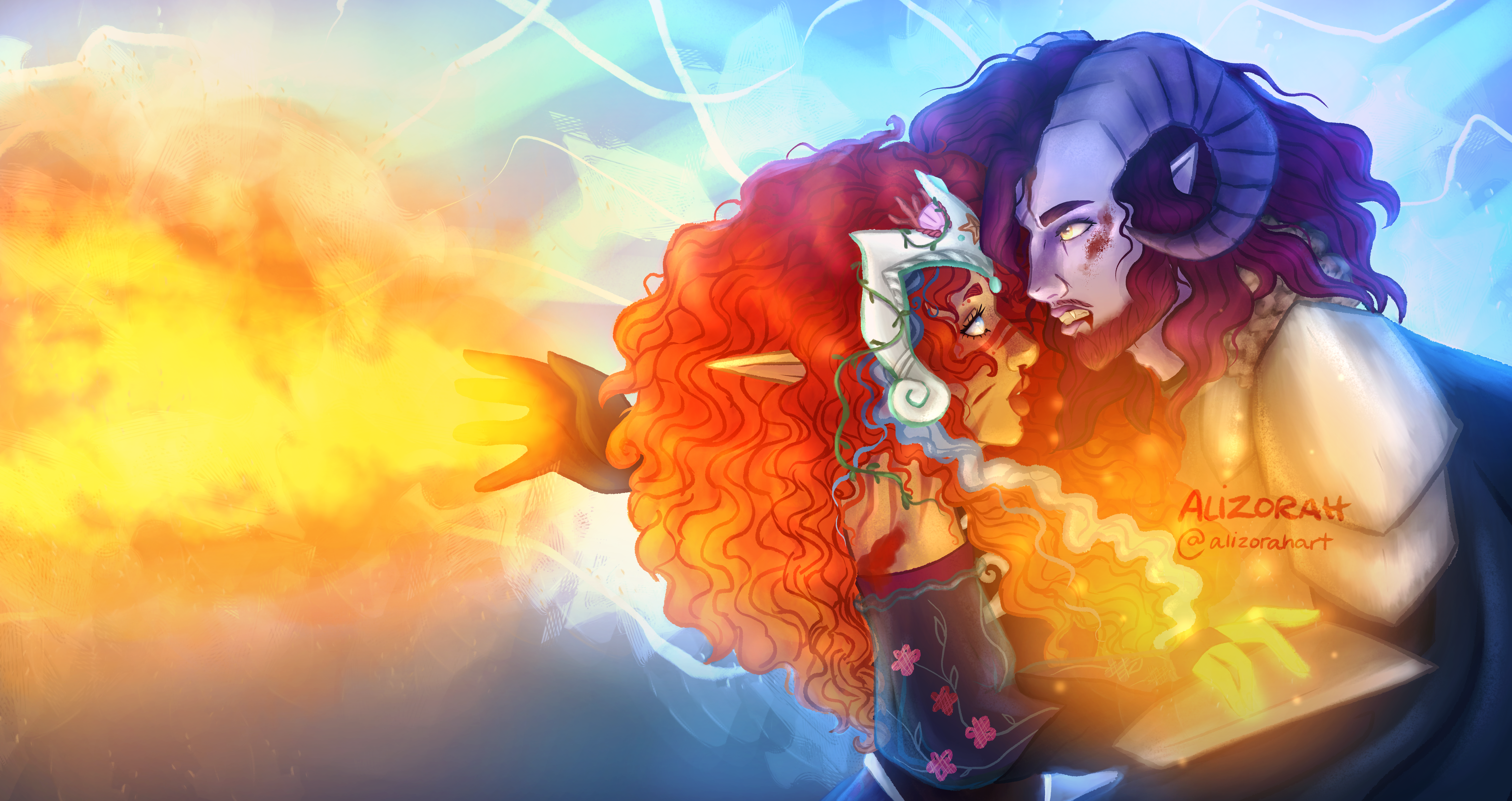 An older drawing, but one I'm still pretty proud of! My partner & I's old D&D characters, Kiva & Leeroy, eladrin druid/cleric & tiefling paladin/sorcerer. Do not use or repost.