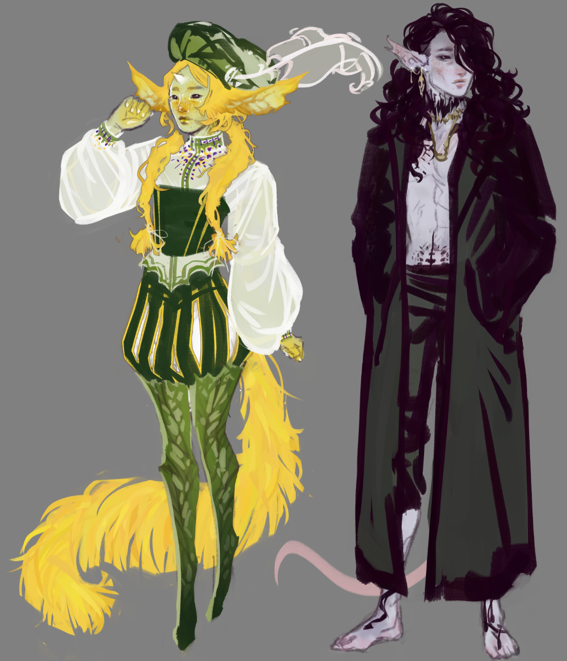 the fey ocs I’ve been working on!!!! updating old designs first one is Pien Duskmeadow, formerly an eladrin twilight druid/ celestial warlock and now………… something else? possibly a bard or artificer.. They are a fashion enjoyer and tailor! (currently working on their seasonal forms and clothing design) second is Slieka (temporary name, hopefully. it means earthworm), a hexblood long death monk! A grave robber and bone enjoyer (currently struggling with their tattoo designs, especially what words to use on their knuckles) (he/they for both)
