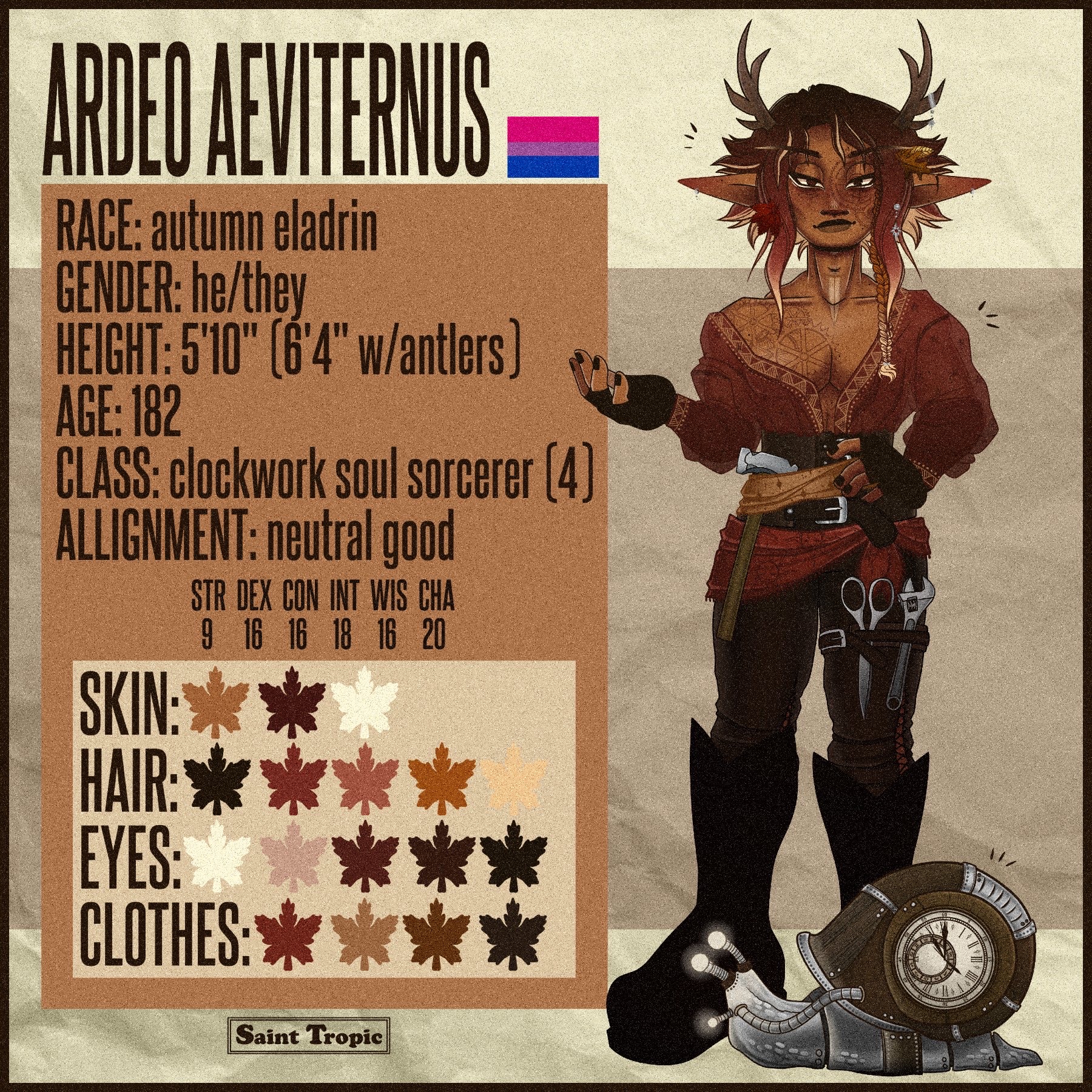 This is Ardeo, or Deo for short!! He’s a (primarily) autumn eladrin who’s malewife malewhore. He works at his father’s repair shop the Dizzy Sproket with his siblings in the faewild which specializes in clocks and other mechanical trinkets. A very..interesting repairman job since..the faewild is..the faewild and time do be loopy. He’s a clockwork soul sorcerer who’s power comes from a litch, which one of his sisters is the direct descendant from. Being a very good boy tm, he DOES find himself at odds with using this power. An internal struggle if you will. He is a hopeless romantic, hates conflict, a bit of a scaredy cat, but at the end of the day? Would do anything for his friends.