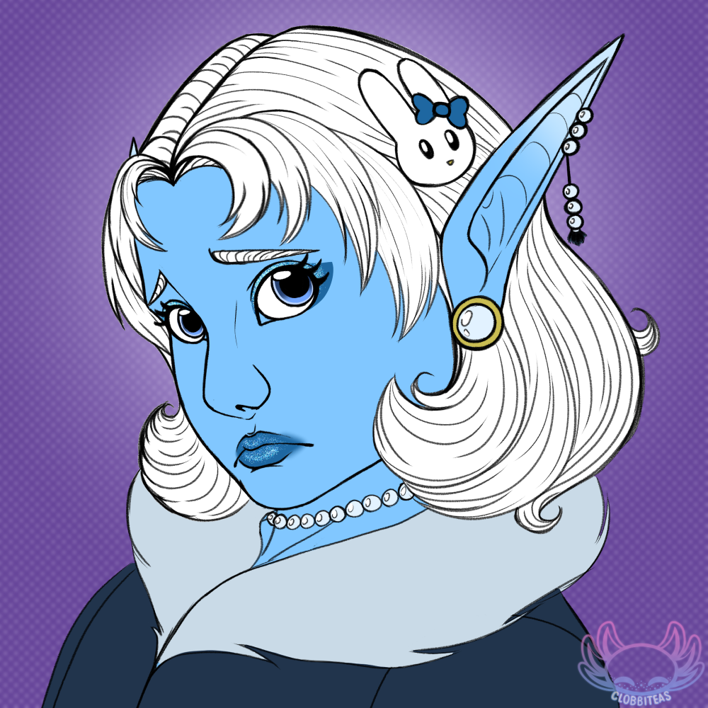 Magdiel Liadon, mother to the Temphere party's boss Valanthe. She and Valanthe have a tense relationship, unfortunate as they're in charge of different halves of the same city. Magdiel is an eladrin elf, something that's now different in D&D 5e but in Temphere, means purple with crazy-long ears. Fun fact, Magdiel's dress is meant to be bee or honeycomb themed~