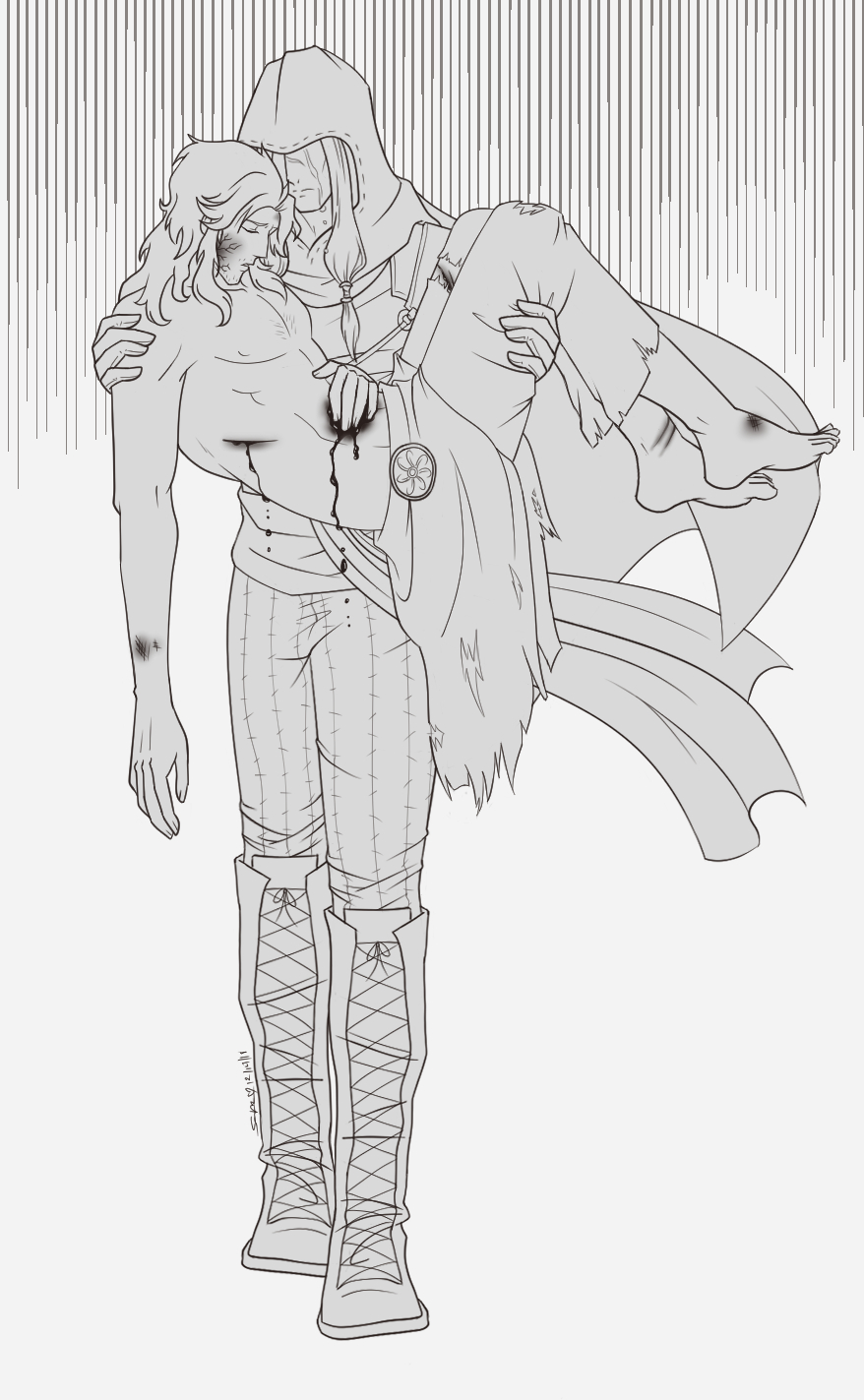 A chibi image I did of Ardyn & Cor from FFXV surrounded by Ardyn's Armiger. Cor is his Shield in this AU.