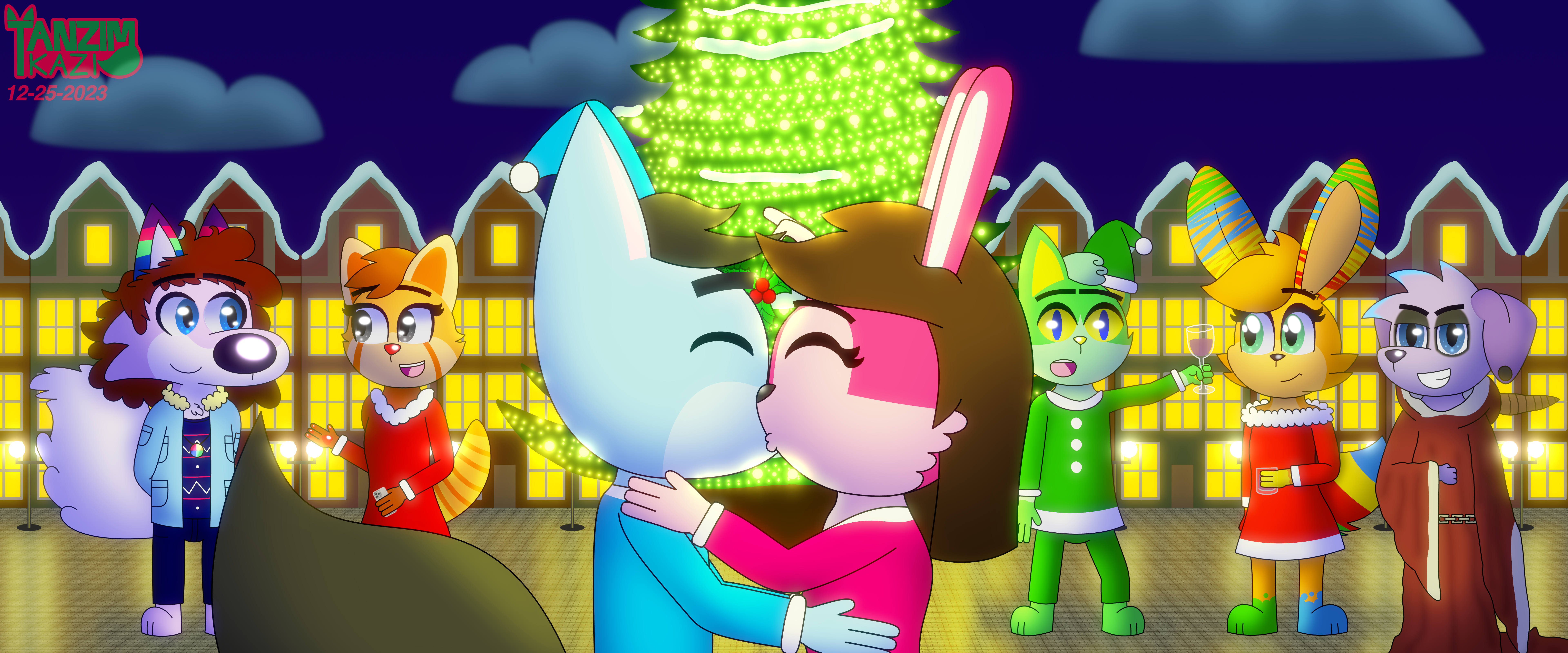 Featuring Wodienfor and fnafdoodle It's that time of year again. This time, it's a Christmas party taking place at a city square, with Tanzim, Penny, and their friends having a good time, with the former two making love. While the couple are kissing under the mistletoe, Jade and Doodle are drinking a mocktail. (consisting of Señorial, grape juice, and lemon-lime soda). Jade is saying "SEÑORIAL" with a hammy tone. Hayden is dressed as Krampus since he's not really into the jolly stuff of Christmas. On the left, we see Zahra and Wodi having a conversation. They probably talking about a music video. Tanzim Kazi, Penny Paline, Jade Green, Hayden Seong, and Zahra Jameel belong to yours truly. Wodi Wolf belongs to Wodienfor. Doodle belongs to fnafdoodle/Doodzie.
