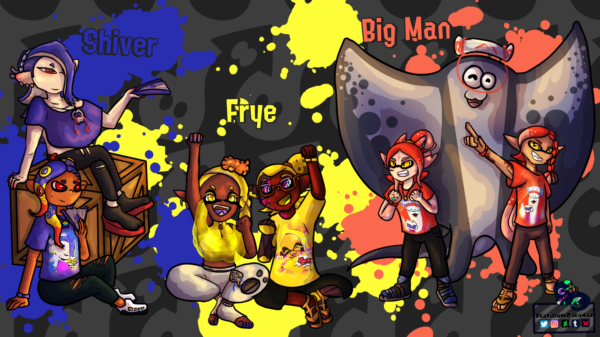 Finished on October 27, 2022. An outfit swap between the Squid Sisters and Deep Cut. Here's Frye as Callie, Shiver as Marie, and Big Man as Judd! Painted in Clip Studio Paint. Speedpaint: https://www.youtube.com/watch?v=kvzblDP49eY