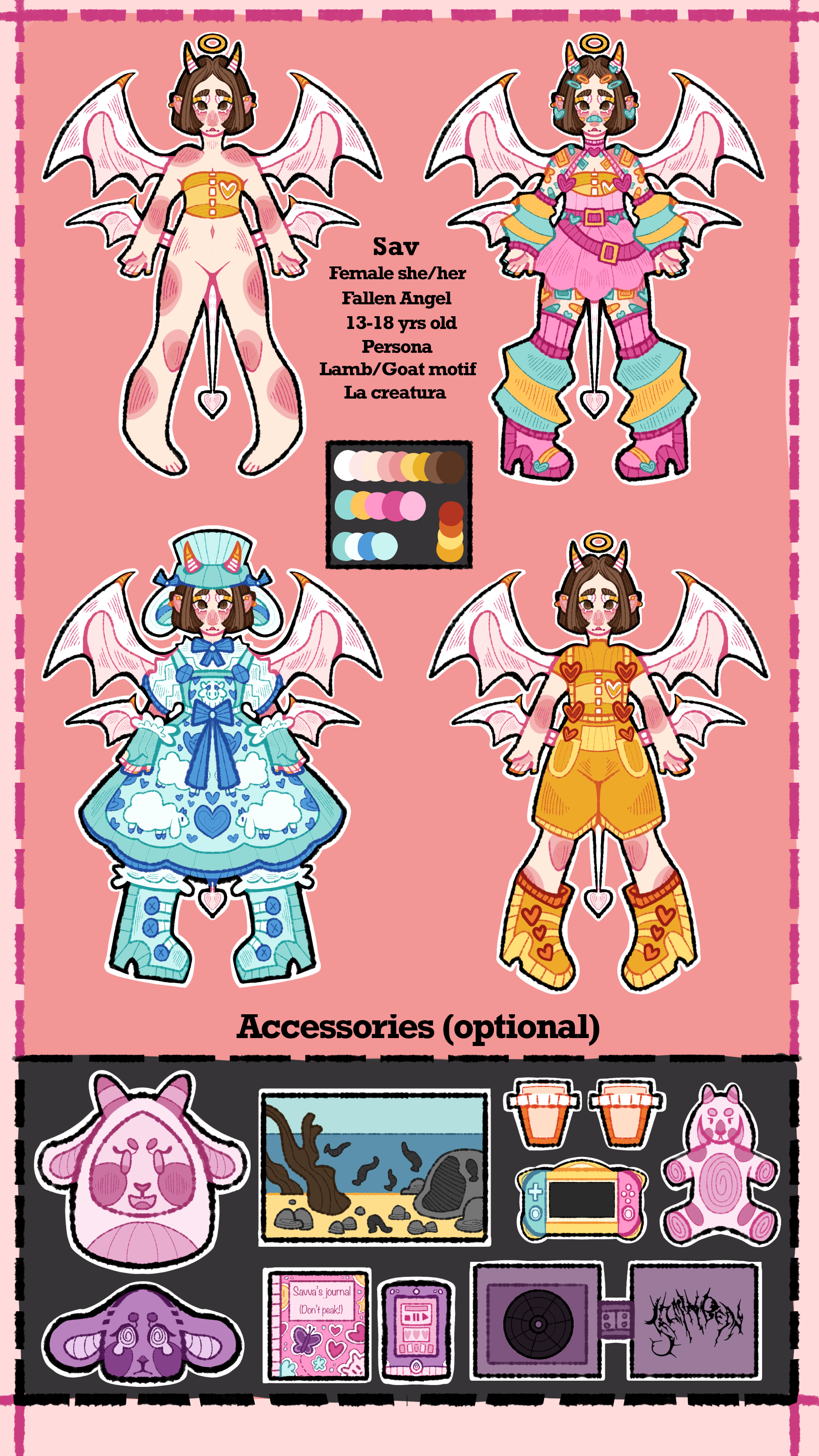 Sav is yet another sona! Below are her story and notes: +She is a fallen angel+ +She uses she/her pronouns and is sapphic.+ +Sav is an angel that fell for unknown reasons; she does not talk about her time as an angel very much and typically avoids the topic altogether. She spends most of her time decorating a small abandoned house. Despite the building being somewhat dilapidated, she takes a lot of pride in refurbishing it. Currently, Sav is in the process of painting the insides a lovely pastel pink!+ +Sav works at an ice cream cafe parlor! She enjoys the calm energy and enjoyable aura of watching people go about their days. She's a huge people-watcher and spends hours gazing at different situations that arise. She occasionally attracts the attention of customers with her flamboyant outfits! Although shy, she does enjoy the occasional compliment!+ +Most of the time Sav retains her age as 18, however during times of great stress or memories of her time as an angel, she may revert back to a smaller more childlike state. (Think Nezuko from Demon-Slayer.) Once the stress is relieved, she'll usually revert back to her regular age. In both states, Sav is a huge plushie collector. She adores the comfort that snuggly friends provide! Her room is filled with frilly girly decor and a multitude of accessories and plushies. After a long day of work, she can usually be found snuggling up with her Switch.+ +Sav's chest/upper abdomen is a translucent gold, and her spine and heart can be seen through it. Being an angel, she does not have true organs or human anatomy. Her chest feels smooth and warm to the touch, with a slight shine to it. Sometimes food she eats can be seen swirling around in there before being dissolved! She considers it a fun party trick! When she feels flustered or nervous her heart glows and beats louder, and when she's sad or stressed it breaks in half. (Don't worry though! It mends itself with a little self-care.)+ +Sav has many hobbies and interests! Among her favorites is her tank of pet leeches! They're her sweet babies that she cares for deeply. She has roughly 12 of them in a large very decorated tank! She enjoys reading them bedtime stories and dressing them up in tiny leech-sized hats and bows.+ +Other hobbies Sav has includes; gaming (Switch n' PC), fashion design and coordinating, plushie and vintage toy restoration, interior decorating, binge-watching shows, drawing/art, Going to cafes, and reading! Despite enjoying alone time, Sav is not a homebody, and enjoys meeting up and socializing with others!+ +Sav has a Lamb/Goat motif, as well as a heart motif.+