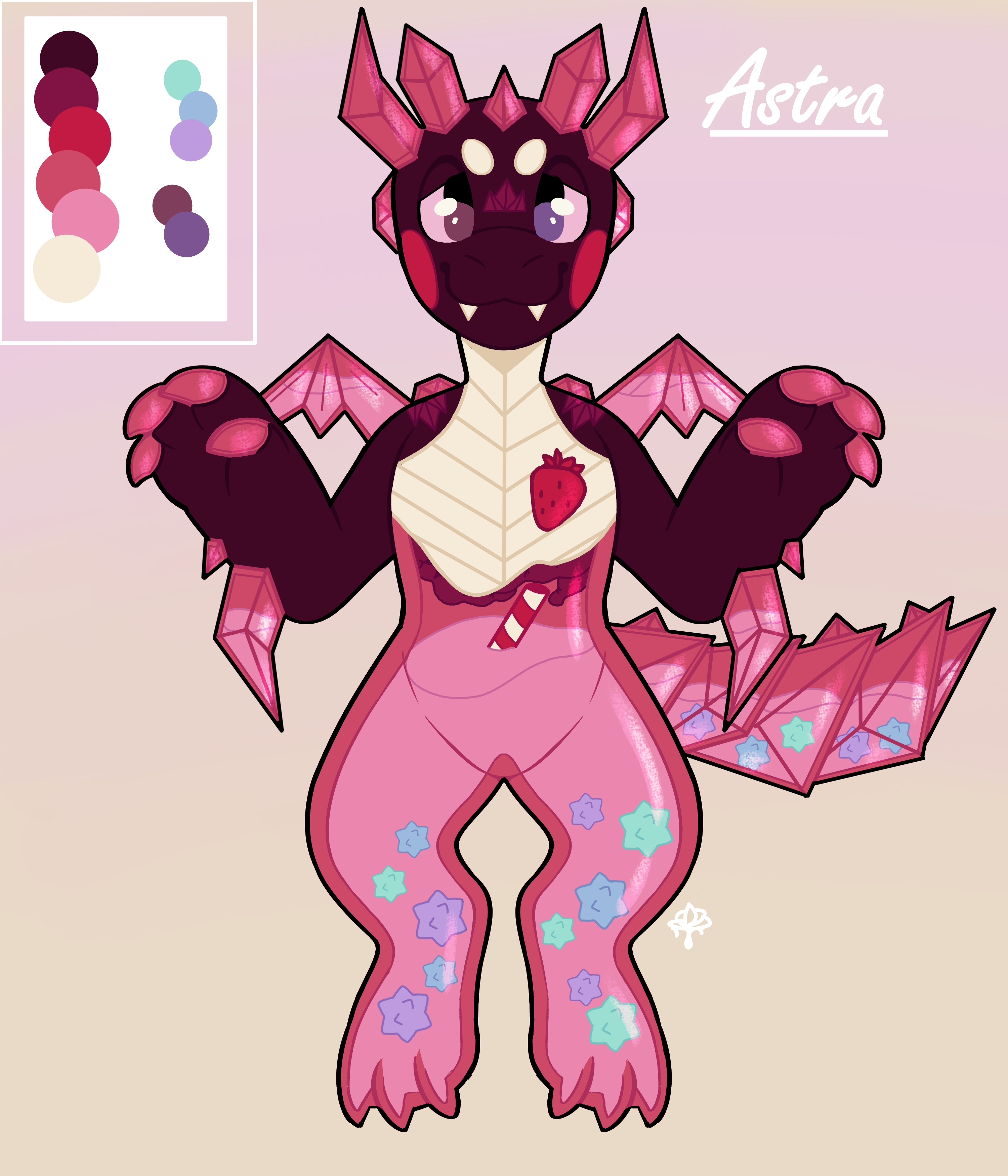 Felt like making something cute today as opposed to my usual dark cyberpunk stuff, introducing Astra! She's a charmie crystal dragon Her colour palette is based off red velvet cheesecake and she's filled with strawberry milk tea, konpeito, and gummy guts! I'll be making another that fits my usual art aesthetic soon! The base I used as well as the species itself are by Dracononite, you can find more info on the species [here](https://toyhou.se/~world/53278.charmie-central).