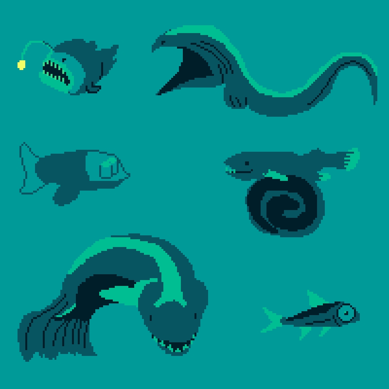 Today's sketch, some deep-sea friends. I'm playing with limited color palettes. [ID: A set of pixel drawings of various deep-sea fish, including the anglerfish, the gulper eel, the barreleye, the black swallower, the frilled shark, and the lanternfish. /ID]