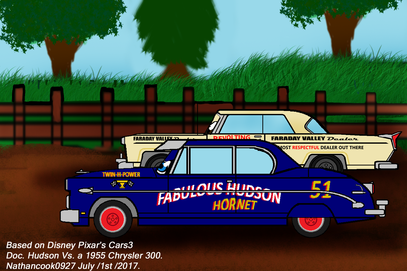 • I'd made this one back in 2017 when Disney Pixar's Cars 3 was out in theaters in this picture Doc. Hudson is racing a 1955 Chrysler 300 during his days of auto racing before his big accident in 1954 judging by this picture Doc was trying to stay ahead of this car knowing that he could face retirement but ended up crashing anyway and would later end up living the rest of his life in Radiator Springs until Lightning Mc. Queen would meet him and learn from him.