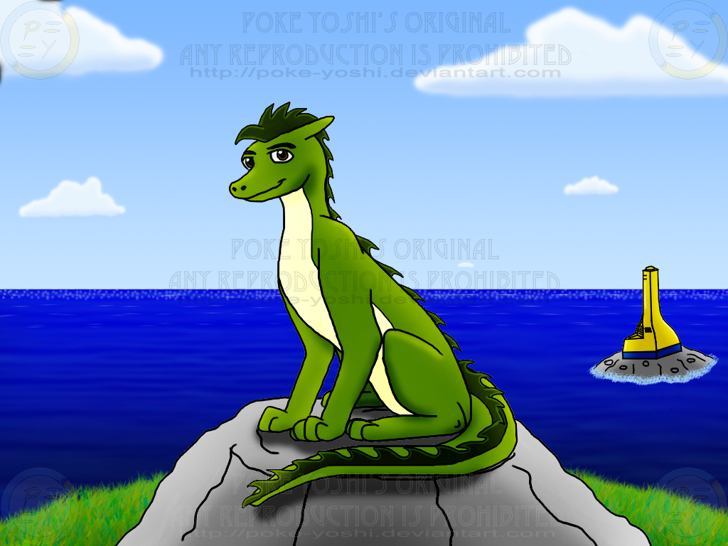 This is a reupload. This artwork was originally uploaded to my gallery on Deviant Art years ago: https://www.deviantart.com/mike-dragon/art/On-The-Rock-121499818 Original description below. ------ ------ :star: **1024x768 Click _Download_ for best viewing results.** :star: :icondonotuseplz::iconmyartplz: _On the Rock of Dolphinport._ Gah... Couldn't find a better name than _On The Rock._ Sorry. D= The draggie from my dream again. :3 I had quite a good time at drawing this. ^_^ This is the most complex drawing I did until now. Better drawn clouds, better drawn water/sea and better drawn grass (okay, I confess... The grass was made with brush. ^^;). Though the sea took me forever to make. D= For a moment I thought it wouldn't never get finished. ^^; But I did it. :) The Golden Tower, from the _Chronicles of Dolphinport_ (Codename: Dele James Tales) series I'm writting/drawing are at the background for a reason. It involves the dragon there. I'm not telling now. If you are curious then wait until episode five or six to know. :) Also, I'm done with his name. Since I couldn't find any cooler name for my dragon, I'm using the first idea I had. So his name is going to be Michael. :) Unless I find a better name in the future. Btw... This is the first time I draw him with a smile. People had been saying he always look sad and I said I would draw him with a happier face sometime, so here it is! :) **_Time:_** _About 6-7 hours_ **_Tools:_** _openCanvas and Photoshop 7.0_ **_Layers:_** _17 layers (not counting the watermarks)_ **_Song(s) heard:_** _The Dream:_ http://www.youtube.com/watch?v=hgbDlolHEac _We Are One:_ http://www.youtube.com/watch?v=glDGAo9SIqs _He Lives in You:_ http://www.youtube.com/watch?v=apEuFdzP5ZU _One of Us:_ http://www.youtube.com/watch?v=HrMRmEeCfJM