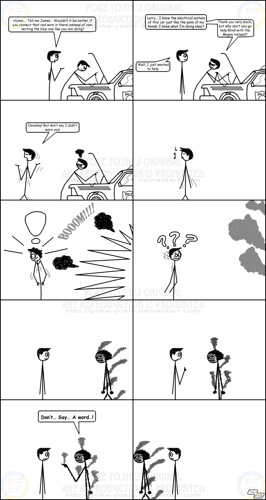 This is a reupload. This artwork was originally uploaded to my gallery on Deviant Art years ago: https://www.deviantart.com/mike-dragon/art/TCDP-Wires-122550599 Original description below. ------ ------ :star: **1031x1933 Click _Download_ for best viewing results.** :star: :icondonotuseplz::iconmyartplz: _The Juice Problem_ ( https://poke-yoshi.deviantart.com/art/The-Juice-Problem-107788663 ) was the first "off story" of The Chronicles of Dolphinport. This one is the second. It's nice to have offs while the next pages don't get ready. :) I had the idea for this one while taking a shower yesterday. =P I wrote the script soon as possible. I had some fun while drawing this one. ^^ James' patrol special unit ( https://poke-yoshi.deviantart.com/art/WIP-Dolphinport-Police-Car-107995205 ) is under preventive maintenance, and James is working on it. For some reason he's not in a very good mood. When Larry tries to help him, he gets angry and tells Larry to help Blind (you'll know Blind on episode 4) with the prototype of the brand new Magna Unit ( https://poke-yoshi.deviantart.com/art/WIP-Magna-Unit-109941810 ). When Larry leaves, something happen. **_Time:_** _About 3 hours_ **_Tools:_** _openCanvas, MSPaint and Photoshop CS_ **_Layers:_** _2 layers (not counting the speeches and the watermarks)_ _Dele James – The Chronicles of Dolphinport – Copyright © Michael F. de Godoy/ Poke Yoshi 1996-2009 All rights reserved._