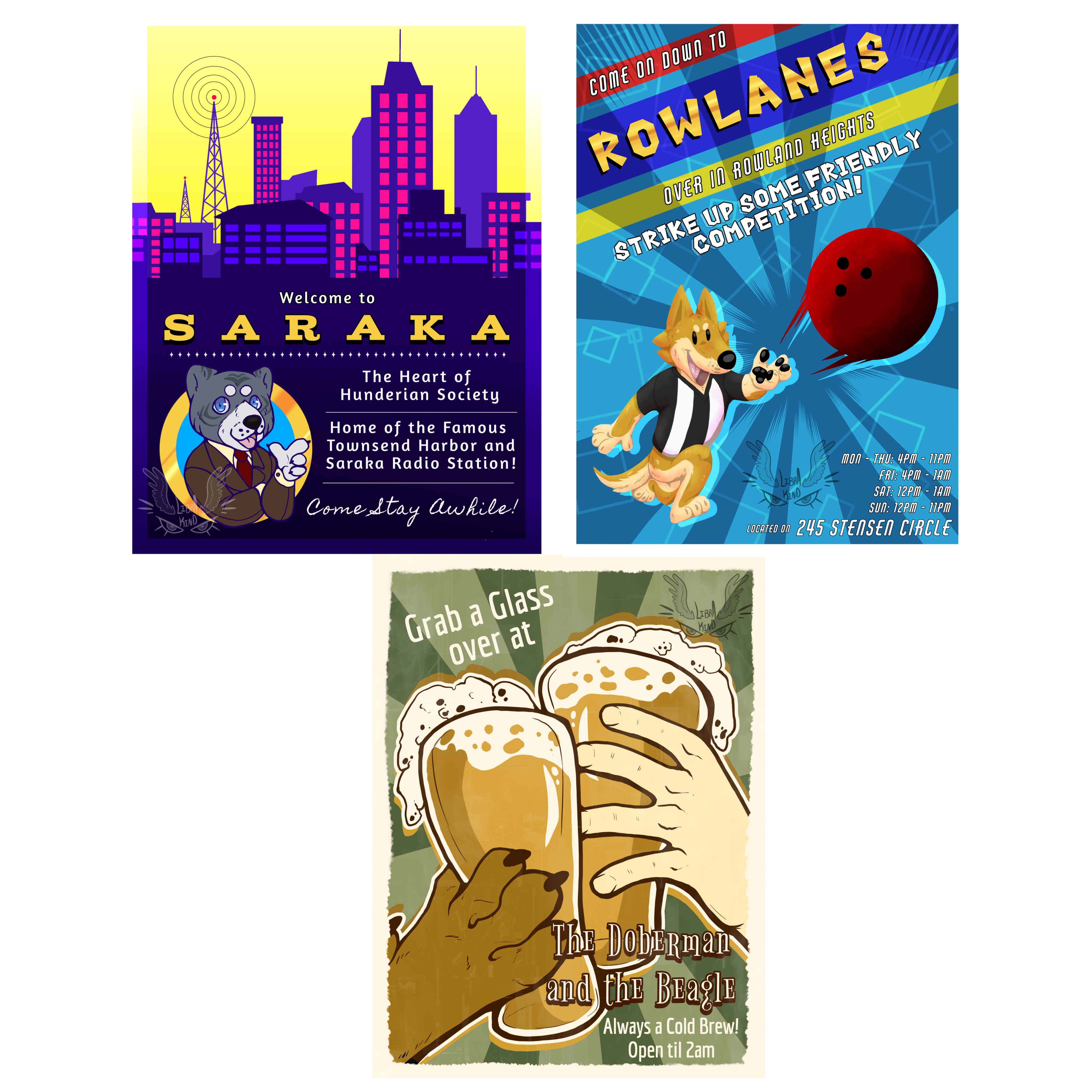 Technically the first set of posters I did for my universe I always thought making stuff like this for one's story is fun These would exist in universe and is the first drawing of Townsy!