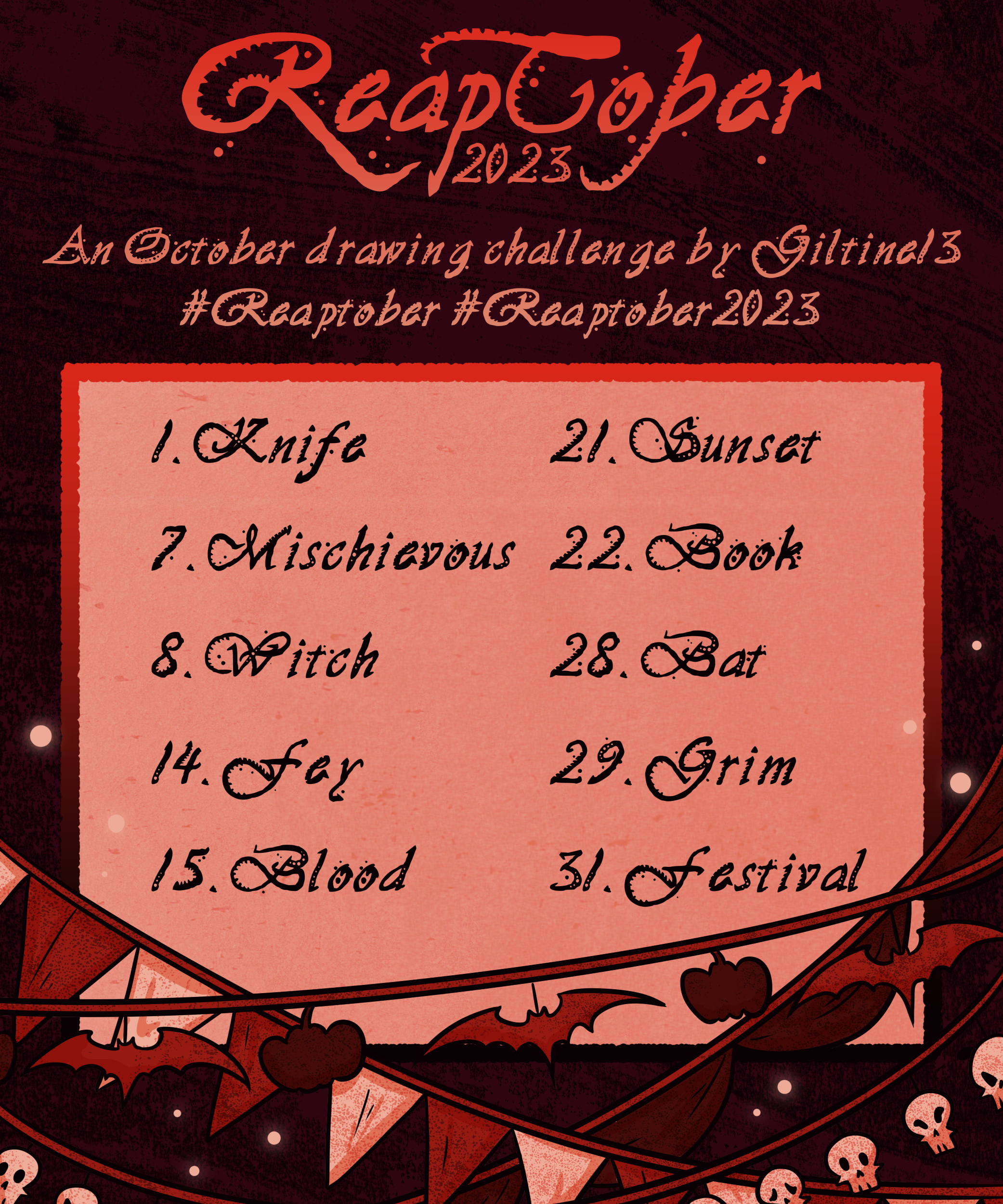 Oyo oyo! It's the spooky time of the year again, so time to host the first Reaptober on here!! (It's technically my second year hosting but, I wasn't on the site back then, so first for here!) Now for the rules! -Make an art (can be just a sketch, an ink, a finished illustration) following a prompt from the list! -Post it! On the prompt day. Or share it around if you're not into social media, just let someone know you did it and be proud of your achievement! -When posting use the hashtag #Reaptober and/or #Reaptober2023 -There's no pressure to do all of them, or even do them on the listed day or order, just make some art and enjoy yourself without stress! It's cool if ya make just one! -Going through the tag and commenting on other people's work is also appreciated! Share some love! And that's it! Though feel free not to follow any of those, if you don't want to or make up your own rules and approaches, I'm here for all the creativity and enabling it haha, not to boss anyone about! Just have fun, go wild and have a spooky time!