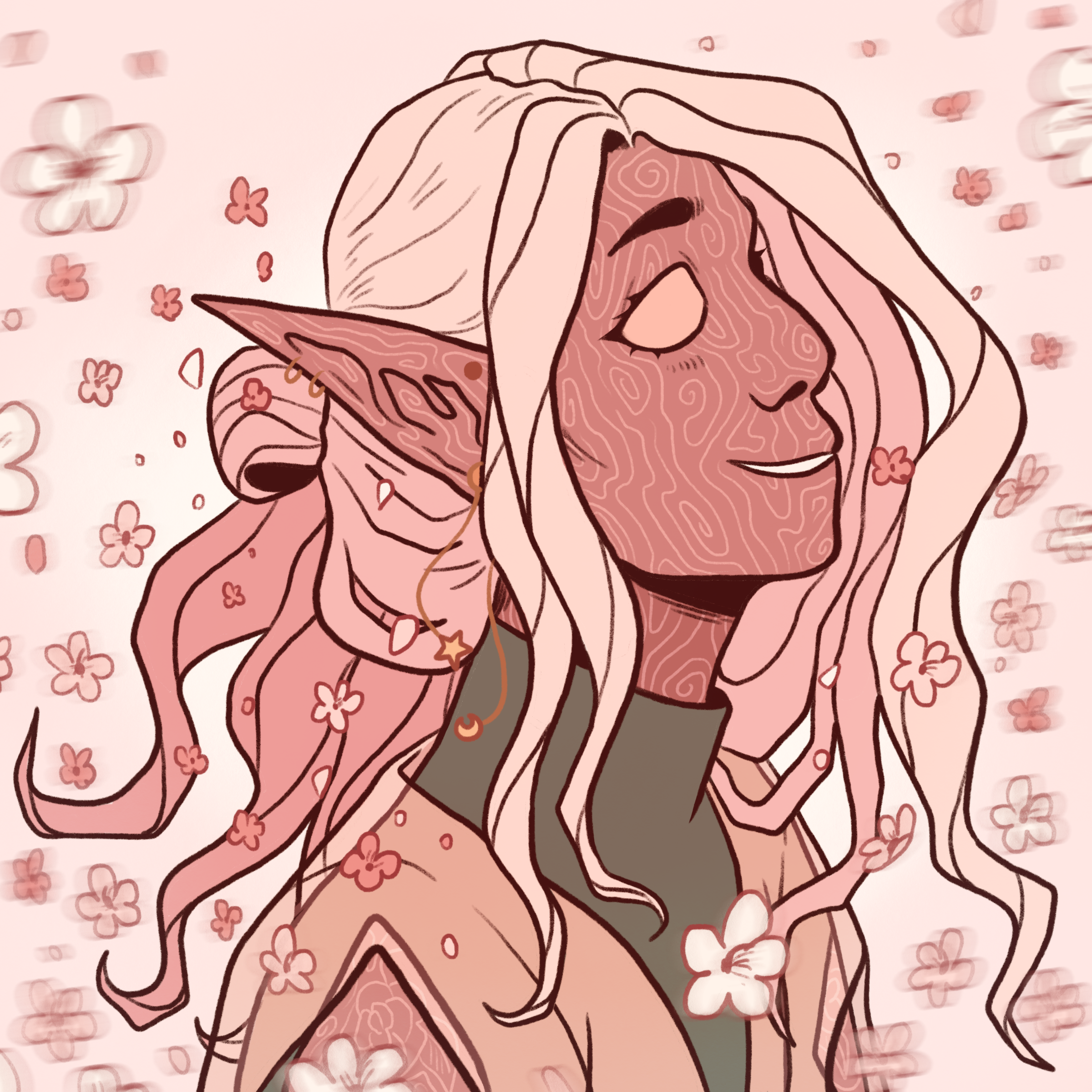 It was as if a piece of home were lifted and dropped within this little clearing. Flowers of all kinds littered the ground, climbing up into the large trees that acted almost as walls. An abundance of color lay everywhere one looked. She lifted a hand as she passed underneath one of the more willowy trees, lightly brushing through the strands of purple leaves and flowers that dangled delicately from the low-hanging branches. She walked as if in a daze and sat herself in the middle of the blue-green grass where the flowers were small and seemed to dance in a gentle breeze that could not be felt. Lan joined her, seeming pleased with himself.