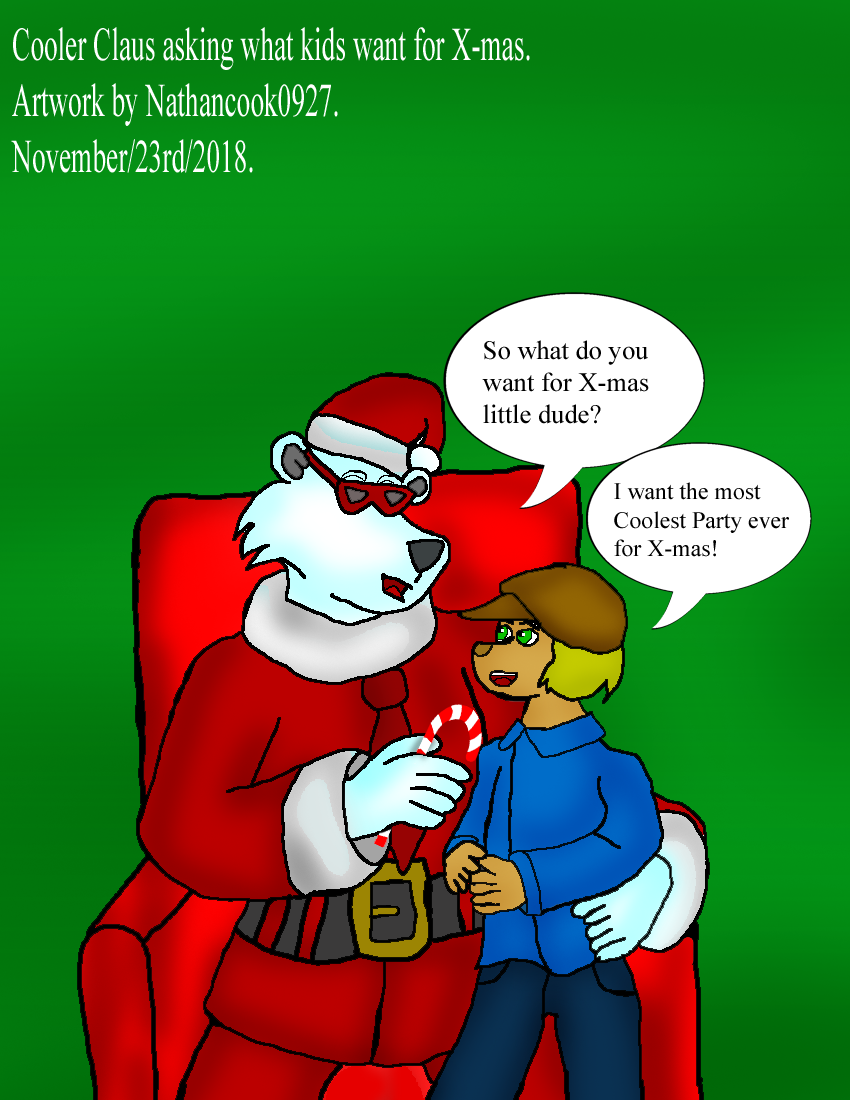 I'd made this Artwork of Cooler Bear the Polar Bear back in 2018. In this Picture he is asking a Kid for what he wants for the Holidays and he replies: that he wants the Best Holiday Party Ever. Cooler Bear the Polar Bear and the Extra belongs to me Nathancook0927. #Anthro #Polar_Bear #Christmas #Santa_Suit