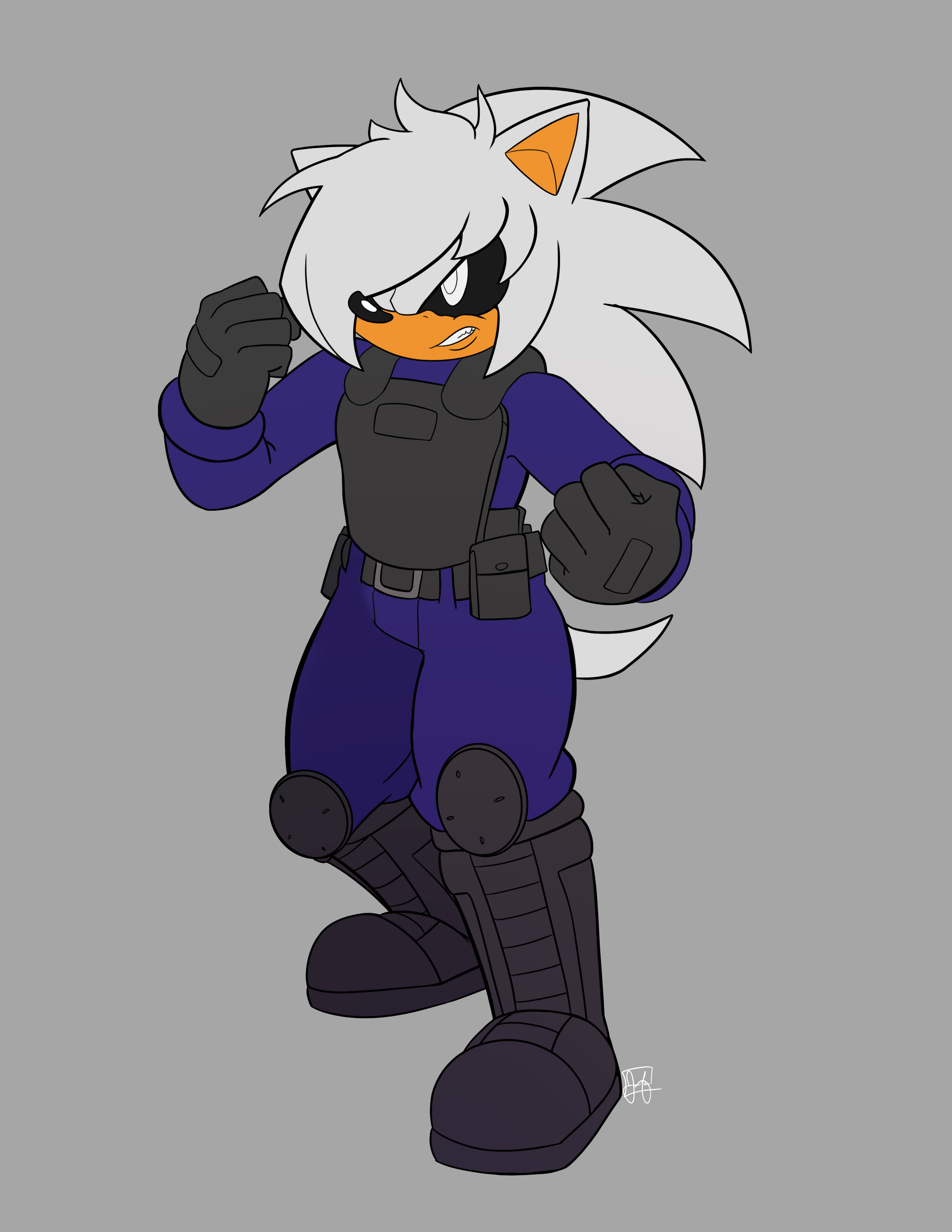 sasha is longhaired with a snow nose, atrophied muscles, lopsided eyebrow dots, orange eyes, freckles, and one eye closed. they are wearing a white hospital gown, green scrub pants, and 3 hospital bracelets, 2 psychiatric on one wrist and 1 medical on the other. they have red, orange, and yellow bandaids in places where you would put an IV.