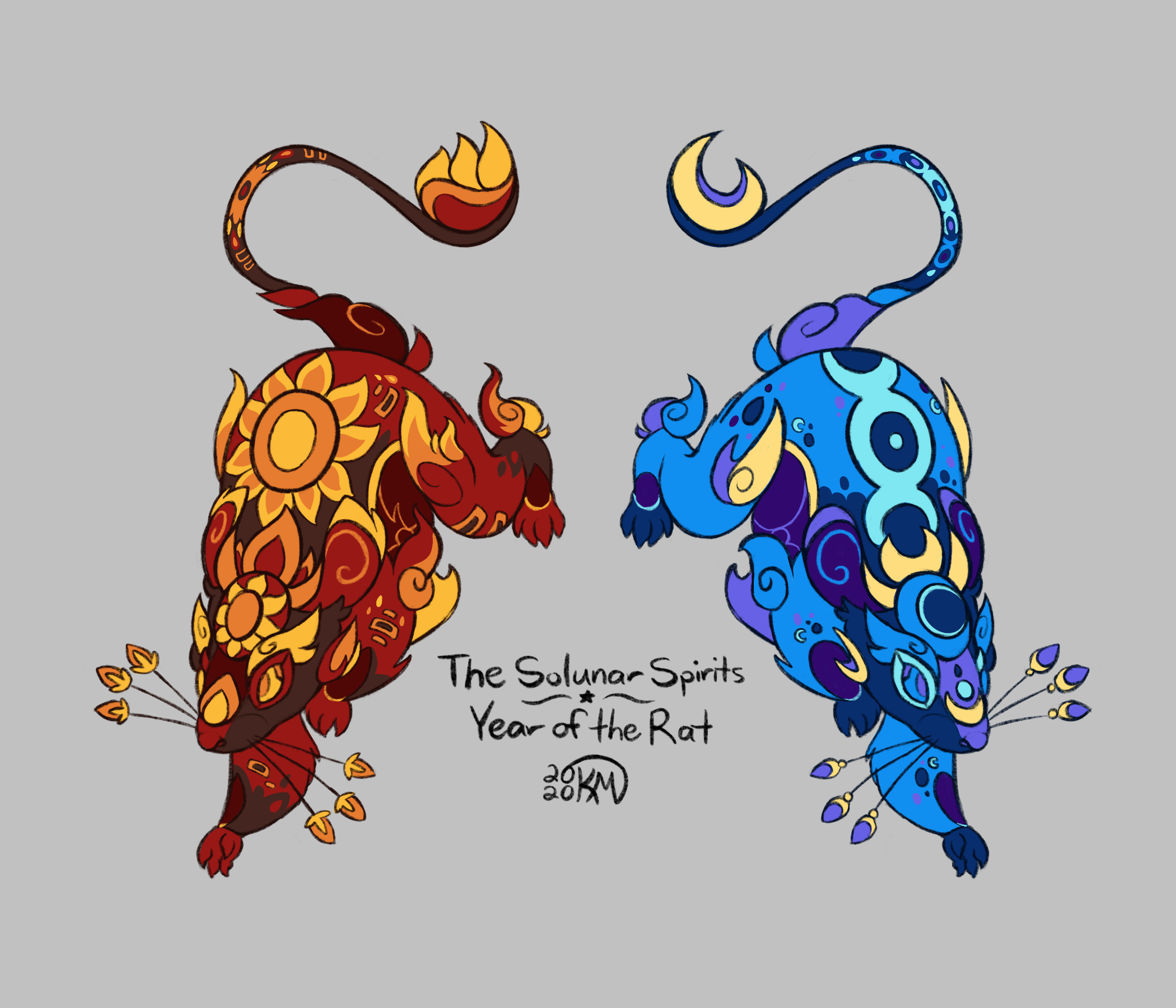 **Originally Created On:** November 27th, 2020 I’m periodically working my way through the different annual forms for the Solunar Spirits, as only a few of them are relevant to the main story, i.e. the rabbit and of course, the dragon! I felt like drawing one of the cuter ones today so I went with 2020’s animal, the rat! :’D Similar to the rabbits, it was an interesting challenge to adapt the dragons’ complex markings and colours onto a much smaller body, while still making sure they looked like the same characters. These two are some of the most complex designs for Starglass Zodiac, but I think that’s fitting for the reigning gods of this universe.