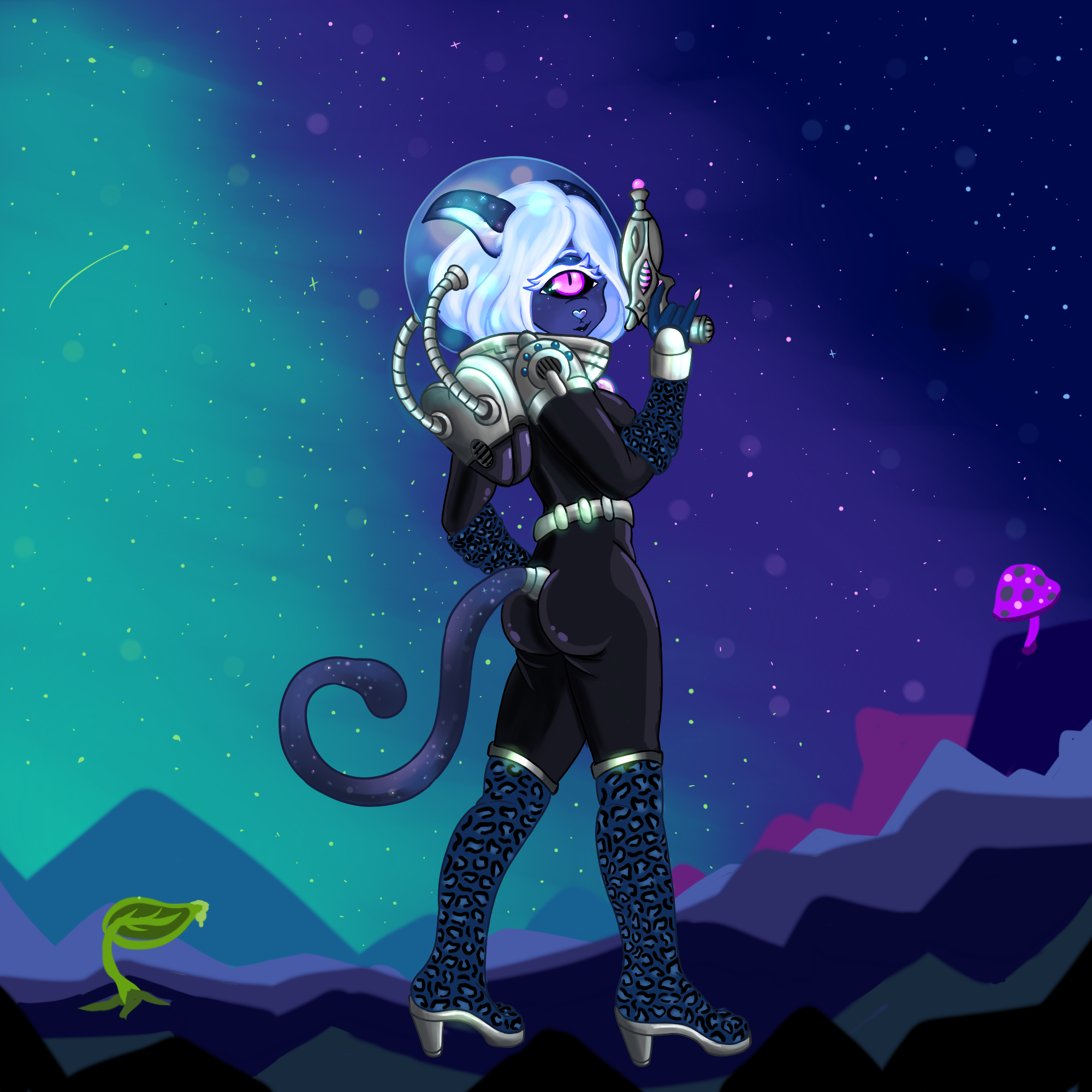First thing I thought of when seeing a cyclops galaxy cat lady, was a tabaxi but space themed, which made me thing of spelljammer. But on your character I noticed you were looking 70's-80's sci-fi themes, so I looked up and did my best in terms of meeting that~. I hope you enjoy this attack! My first one goes too your beautiful character Astra!~