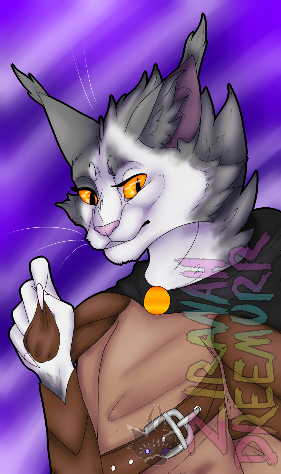 A 6'6 grey and white Tabaxi rogue (Arcane trickster ofc) with yellow eyes and trust issues. She can be a bit of an aloof bitch but she's slowly warming up to her party members. She's claustrophobic and will panic if put in small spaces. She is inquisitive and loves anything shiny. She has a real knack for stealing and has stolen some pretty cool shit. (Amulet of the Drunkard, Eyes of Minute Seeing, an Adamantine chest plate and the Staff of Magi) Silvermoon was raised in Torenth, The Elven Kingdom with her brother, on the street by a merchant, he taught them both how to survive. After he disappeared from their small residence (an abandoned two room building close to the middle of town), which was soon to be destroyed to make room for a new tavern, Silvermoon took his money, and left with her brother. Only being young, around nine, she fought hard and had to grow to be tough, She protected her brother from hunger and from those she stole from, mostly from the rich, rarely buying food for herself, trying to save for a better life for her and her sibling. Eventually they had a big break, Silvermoon had stolen enough money over the years, and after one final heist (Which she is now wanted for) she had saved up enough money for her and her brother to leave and go find a better life. They packed their belongings and left Toreth. One night a few months into their journey to find a better home, after traveling for hours, the siblings tried to cross a river. Exhausted, cold and not strong enough to wade through the powerful current of the river, Silvermoon's brother was swept away. His yowls of distress echoed in Silvermoon's ears ever since. She spent weeks looking down the banks of the river looking for where he could have escaped, but, she only ever found a faint trace of his scent and some footprints that ran off into the dense undergrowth. She stayed in a town a few miles away from the spot he disappeared, hoping that he would find his way back to her. But he never did. Forever unsure if he is alive out there or not. She became slow to trust, scared of the pain of losing loved ones again. After another few years of living on the streets, having lost a lot of her money when her brother disappeared, she decided to leave the town near the river, to travel. She spent about a year on the road before finding a party that she decides to stick with. Something about this group of strange individuals reminded of the happy-go-lucky personality of her brother. The Merchant - An elderly Elf rogue named Lyrandrar. He had blond hair and deep brown almost black eyes that looked like copper in the sunlight. He was kind and soft spoken, made sure to give Silvermoon and her Brother most of his food, doing his best to make sure they never went hungry. He taught Silvermoon how to steal, how to gauge the price of something, how to lie, and be sneaky. She struggled to get the hang of it for a very long time. He left her and her brother one night, no note, no reason to his disappearance. The siblings never found out why he abandoned them. Silvermoon's Brother - A Calico tom with bright blue eyes and one ear, Dappledsky. He was kind, happy-go-lucky, always tried his best to make the others laugh, and to keep their hopes up. He was small. Much smaller than his sister who grew to be 6ft6 tall. His dream was to one day be a traveling astrologist. He loved the stars, and Silvermoon would do what she could to steal books for him, which often got her in trouble. A nearby astronomer threatened to cut off Silvermoon's paws if she ever stole from him again.