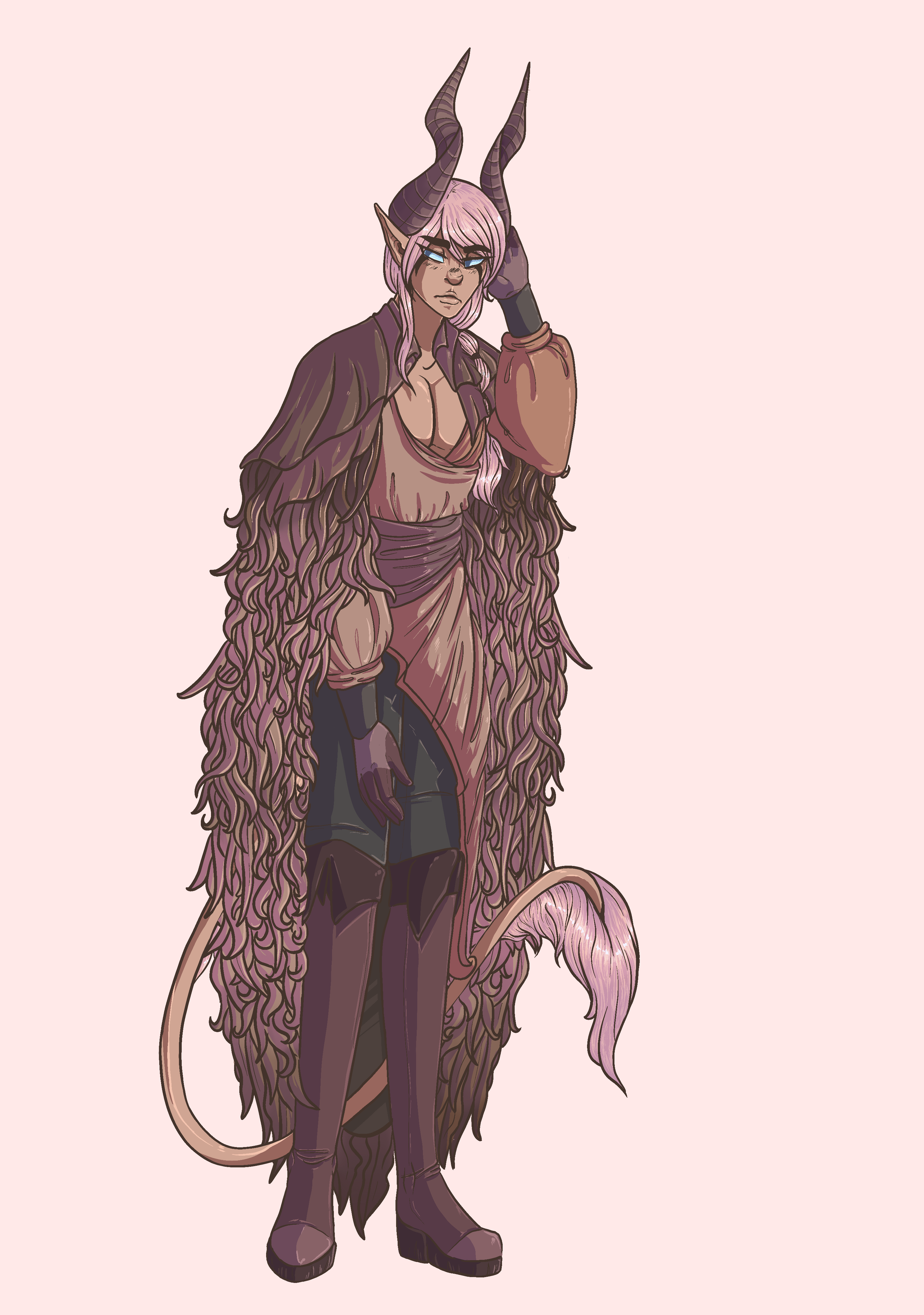 me and my gfs ocs; eilidh (orange tiefling, she/her) and azusa (purple lich thing, they/she). they're in love :]