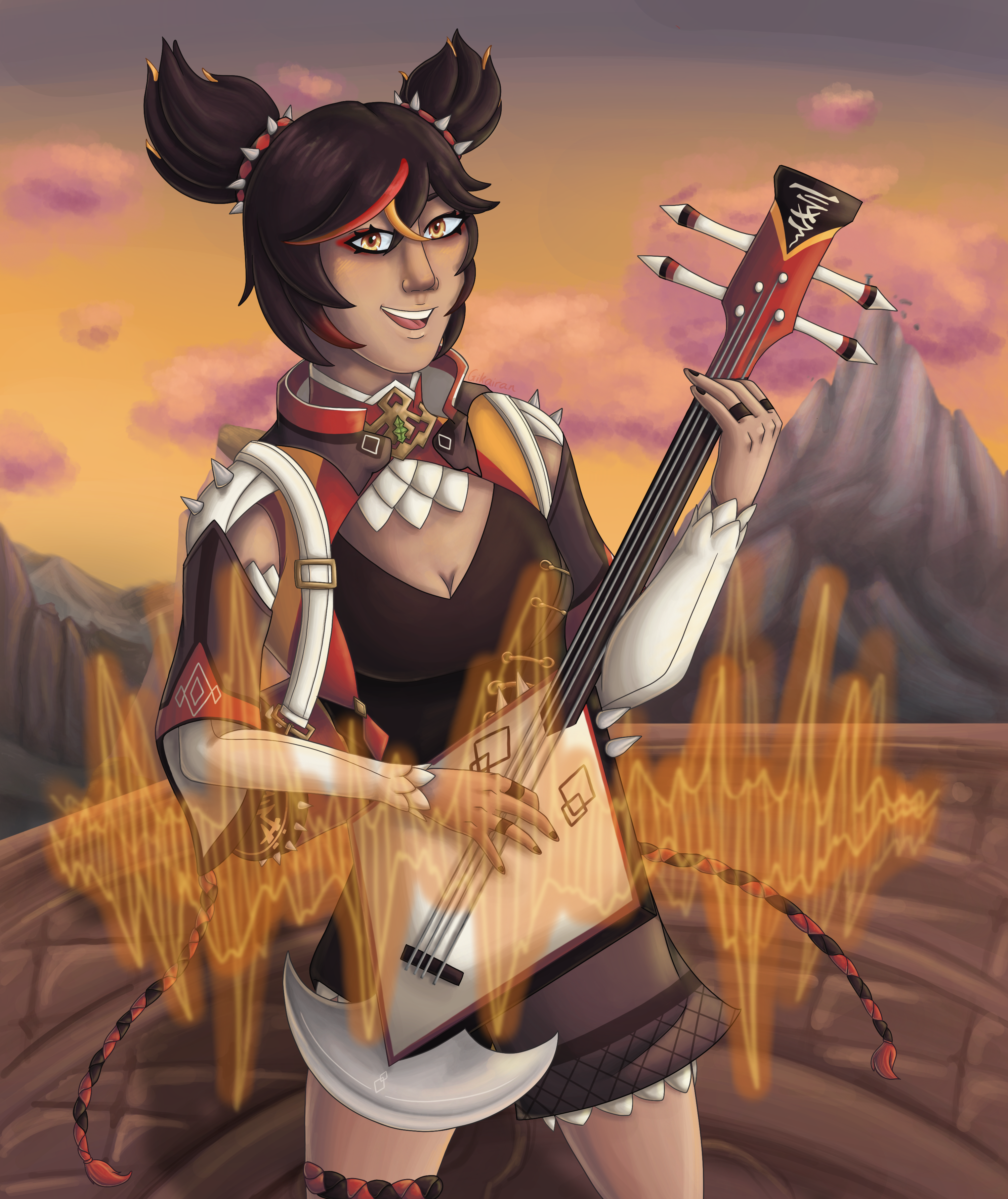 For a contest on the HoYoLabs! When I was thinking about the theme of the contest I wanted to draw the character I felt can bring Joy to the world. I thought of Xinyan because she is so awesome and positive. Rock and Roll can really be exciting and uplifting. I'm happy she is in the current event! I hope to see more of her. She is one of my favs. X3