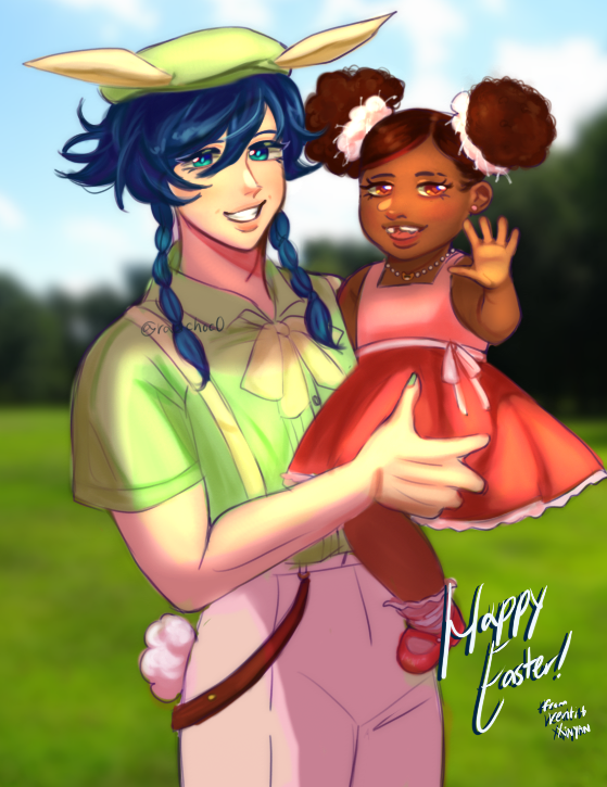 Happy Easter! (idk what easter is abt i just love the cute pastel outfits) this photo was taken at an egg hunt, baby Xinyan ate lots of chocolate & won third place, a bratz doll easter basket. her uncle drove her to McDonalds after. today was a good day ^o^ why is Xinyan a toddler? well this is apart of my family au, venti is her cool uncle. i wont reveal the parents until later on.
