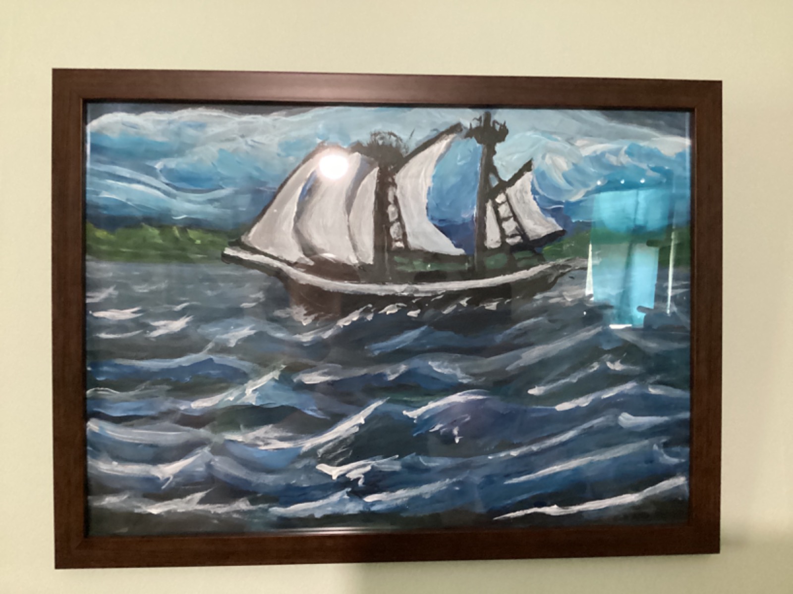 A painting done with acrylic and watercolor on canvas depicting an artist's hand feeding a red-eared slider turtle a piece of cucumber. The hand is covered in paint splotches that match the colours of the turtle and the swirling purple and blue background paired with vibrant colours give the painting a feel of a dream or memory. Gaining the trust of such a skittish animal to a point where one is able to feed them by hand is truly a magical experience and unlike anything I've experienced before.