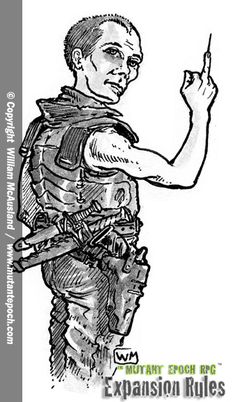 Ink art from page 19 of The Mutant Epoch (TME) Expansion Rules Book using the Outland System Game Mechanic. See a PDF sample here: https://www.outlandarts.com/expansionrules.htm