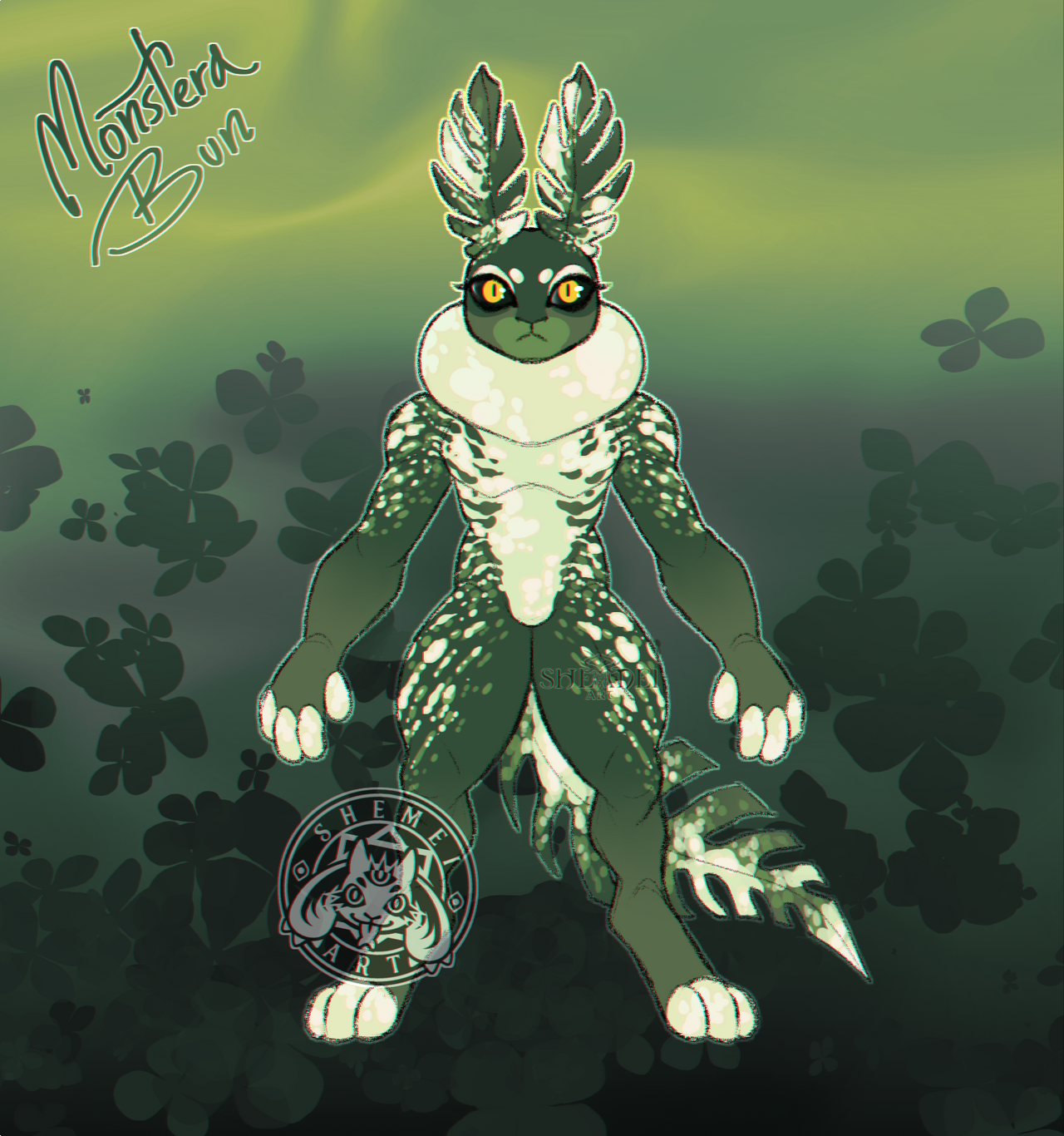 Any comments and shares are highly appreciated! ;u; ------ This is base test adopt for emoji adopts I was doing some time ago, this one was cheaper than those adopts and I thought I will sell it off the batch (as it wasn't emoji related, I just wanted to do plant-based bunny with funky ears haha!) I sometimes stream my commissions/adopts on Secati discord server - here is the link if you want to join: https://discord.gg/ARk8Sm9k ------ **โŸ GENERAL RULES โŸ** * Before buying please read my TOS * When you buy the adopt - you are automatically agreeing with rules mentioned above. * PAYPAL ONLY! * After buying you will receive full resolution separate file (or files) of your adopt without the chromatic abberation effect! * Don't resell for higher price if they don't have any additional commissioned art! * Do not change the original design too much! (Anatomy changes are fine!) * Don't make a species (closed or open) out of them - including twisting them into already made species. * If uploading on TH - please add credit to "on-site creator" - my nickname there is Shemei ------ **โŸ ADOPT โŸ** 1. Monstera Bun Price: 45$ CLOSED! ------ All done in Clip Studio Paint.