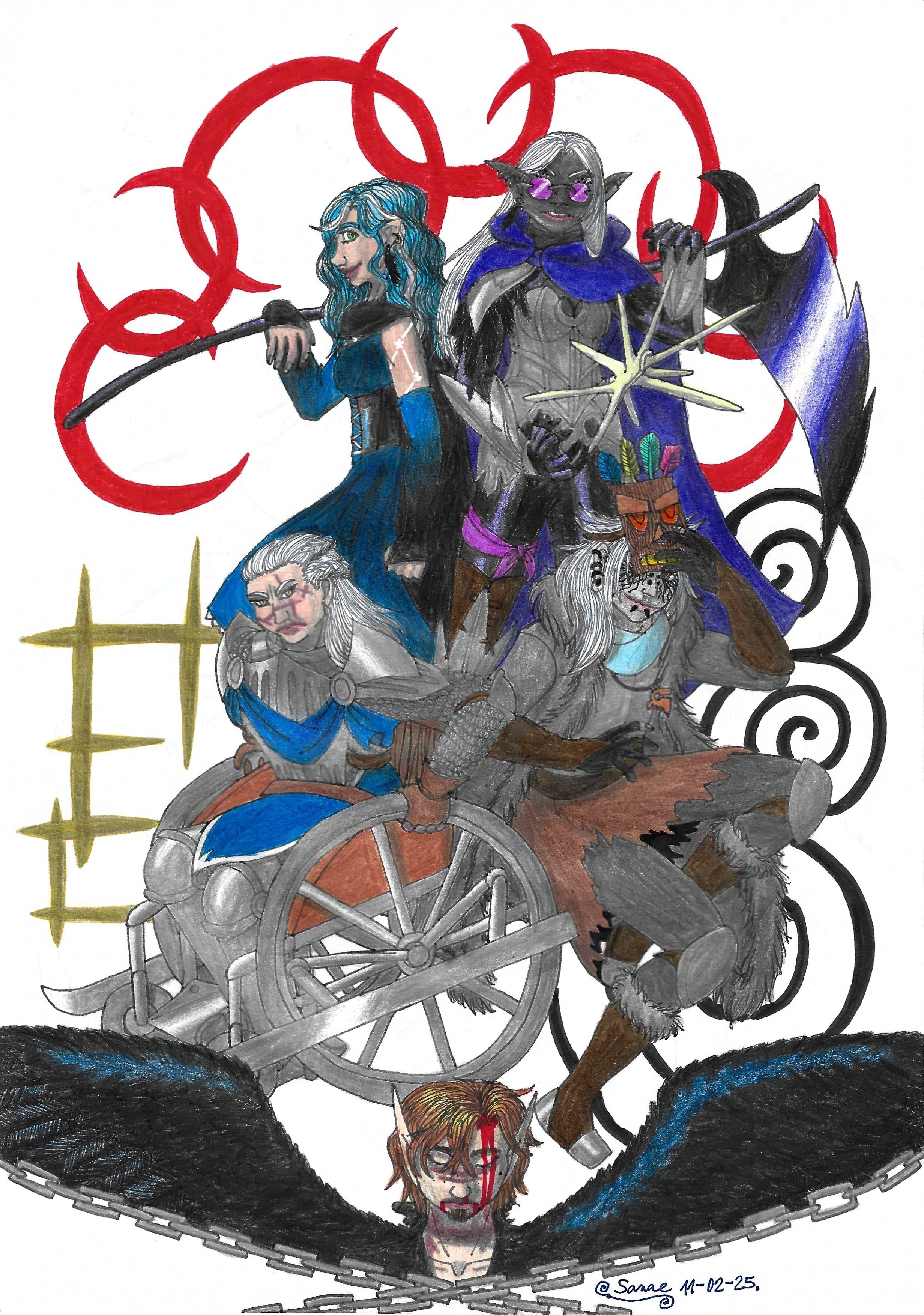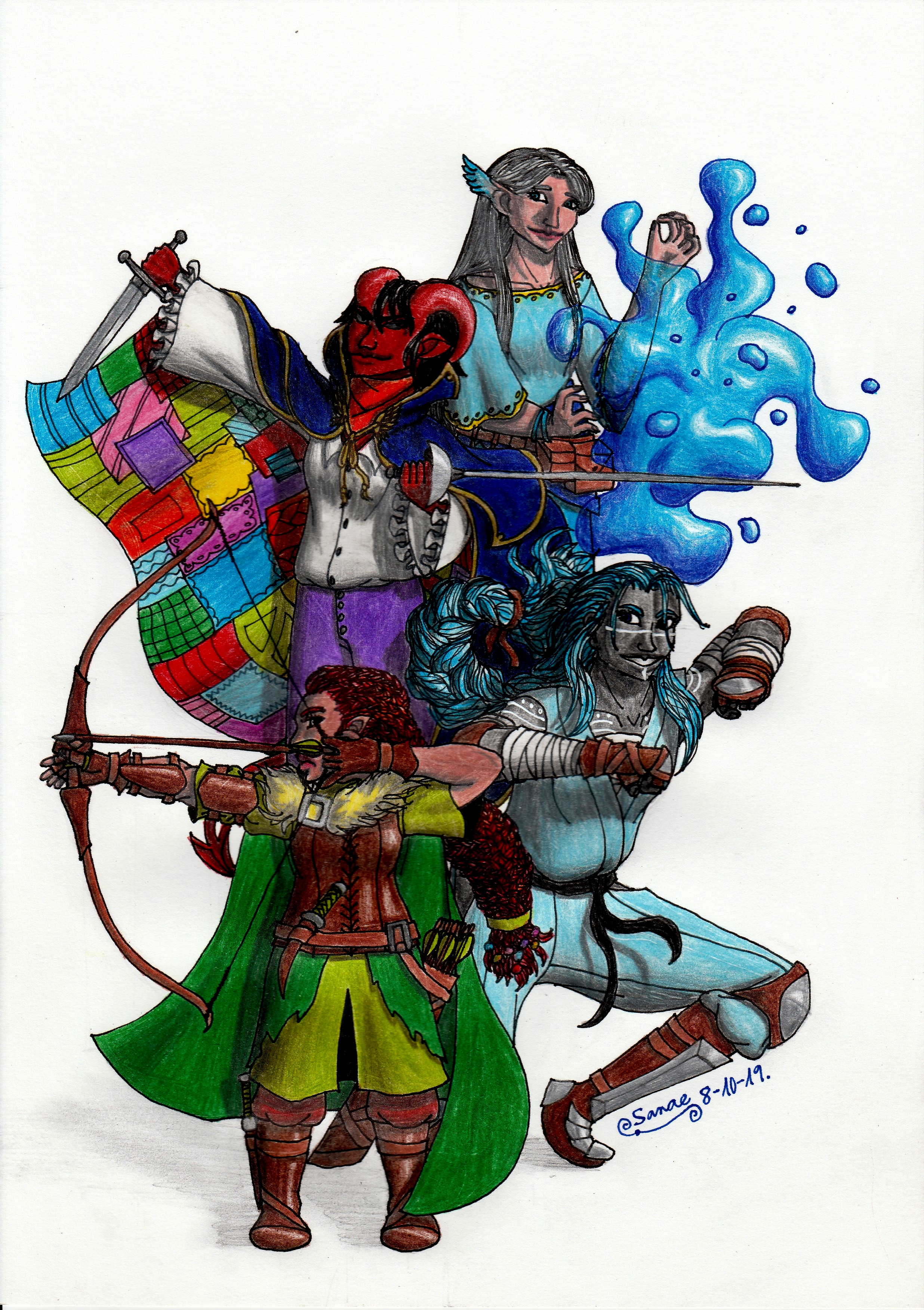 • Once more I'm fullfilling my tradition of drawing the party of roleplaying stuff I get into. This time meet the bold adventurers who went the farthest they've been from home to rescue their common father figure, a certain Messenger of the Raven Queen with a knack for getting into trouble xDDDDD So, from left to right and from top to bottom: