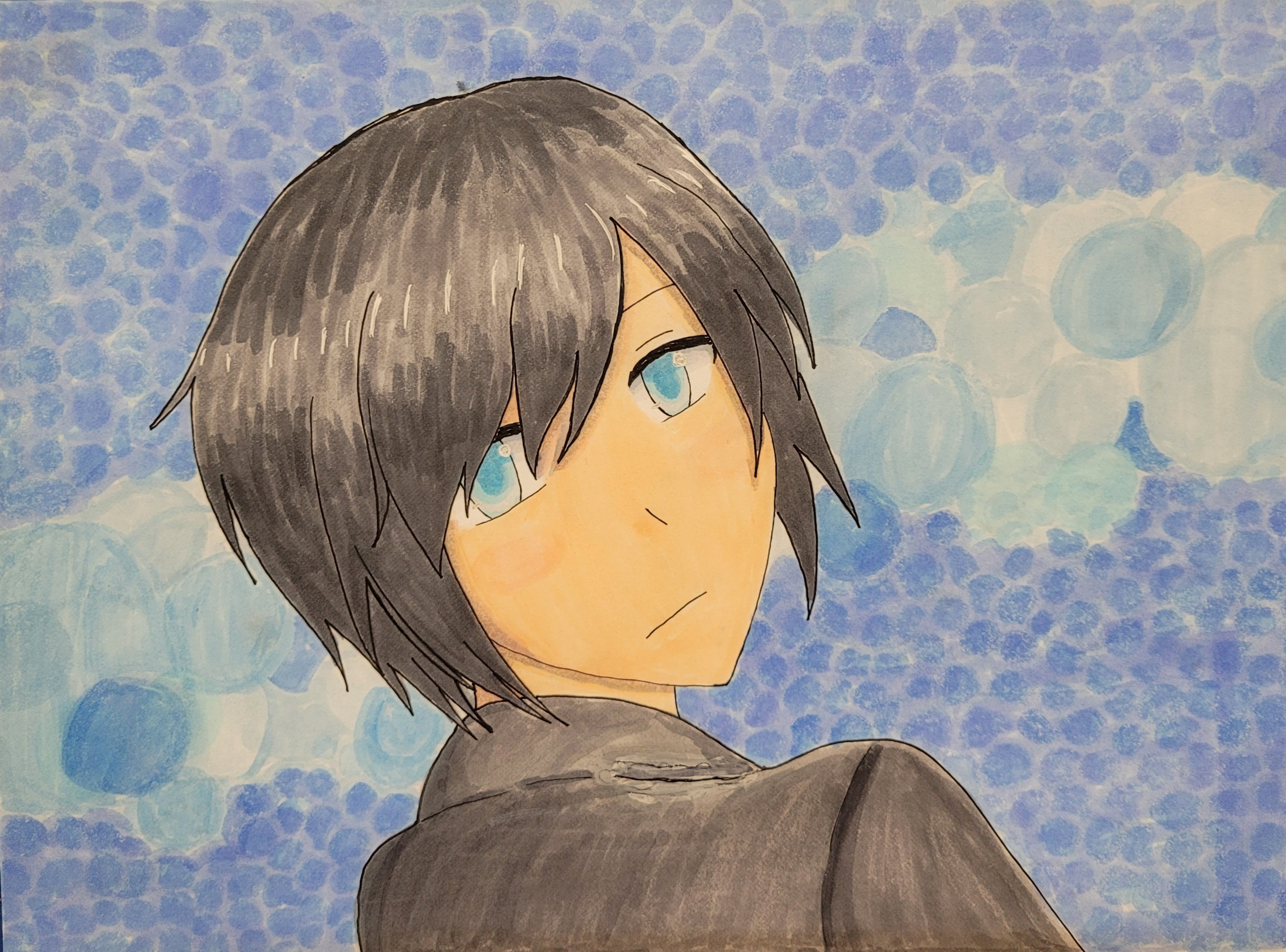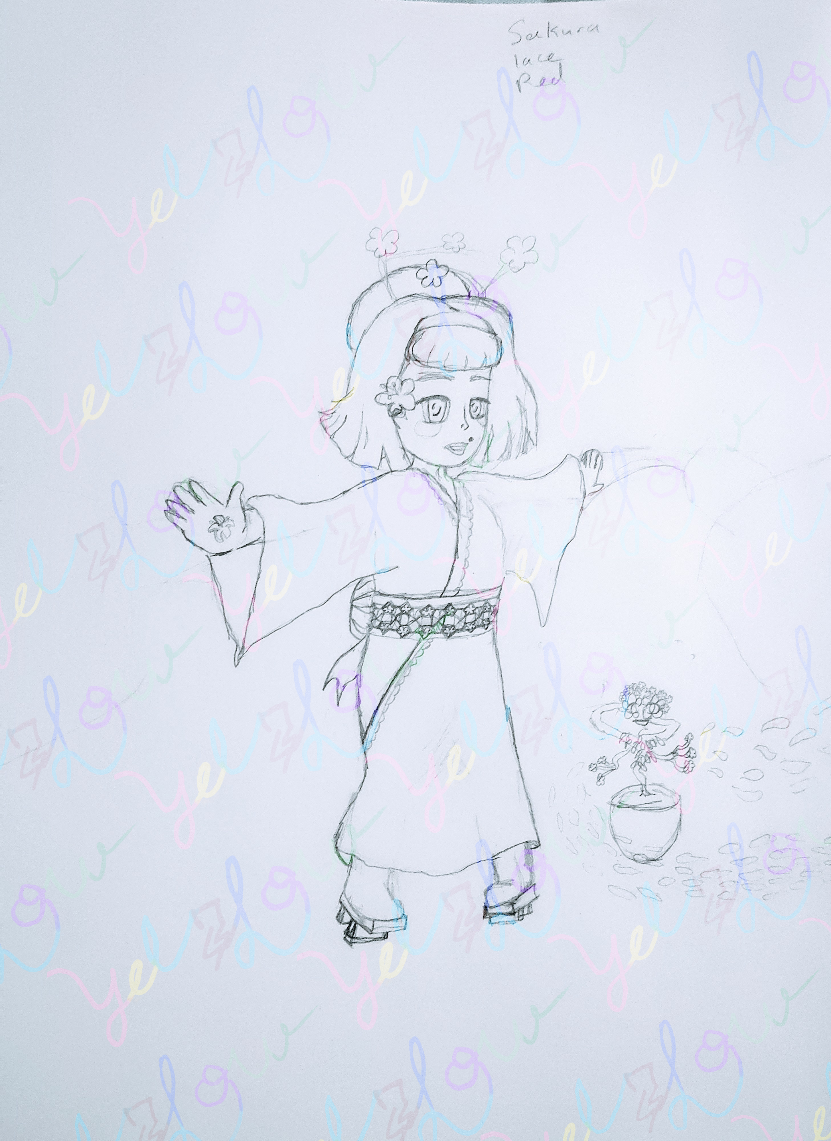 Found this old picture in a folder labeled 2018-2019 art portfolio. Very obvious where my style inspirations came from. I used a random word generator specifically for magical girls (not an AI) for the base words of sakura, lace, and red. Drew up the rest based on it. It is hard to see in this picture since I intentionally drew faint lines, but there is a band coming out of each sleeve, which I was planning on editing digitally later to be some form of lace. Even the border of the kimono is lace. The middle band of the kimono has details of little sakura flowers inside little pentagons in a unique alternating pentagon-triangle-square-triangle-pentagon style design. She has a little head piece with little sakura blossoms too. She is wearing little wooden Japanese style shoes, and has a bonsai cherry blossom tree familiar that spreads sakura petals. I wonder if she would be friends with canon Cube Watermelon's Sleepless Domain characters like Anemone.