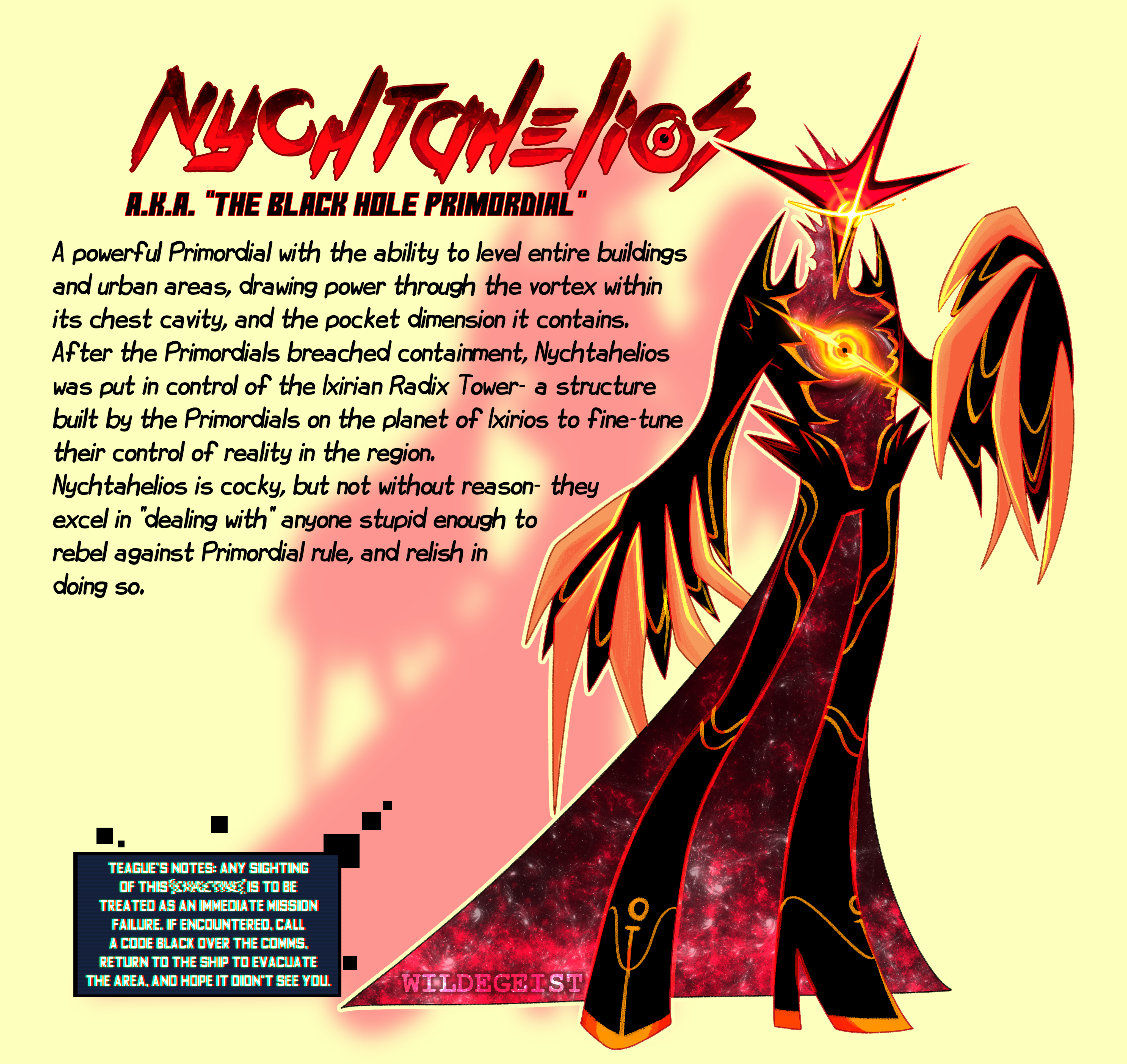 Antagonist from a fun possible Metacosmium canon arc I've been playing with lately, and I wanted to draw the villain from one of the chapters I brainstormed up. The basic idea is that these ancient beings called Primordials who've been quarantined since the early days of the universe broke out and used their reality warping abilities to cause a universe-wide weirdpocalypse that put them in control of that entire universe, and all other spacefaring species under their boot. They effectively have the power of gods, and most people either resigned to their rule, or chose to live in hiding, albeit with the risk of being killed if they're caught.