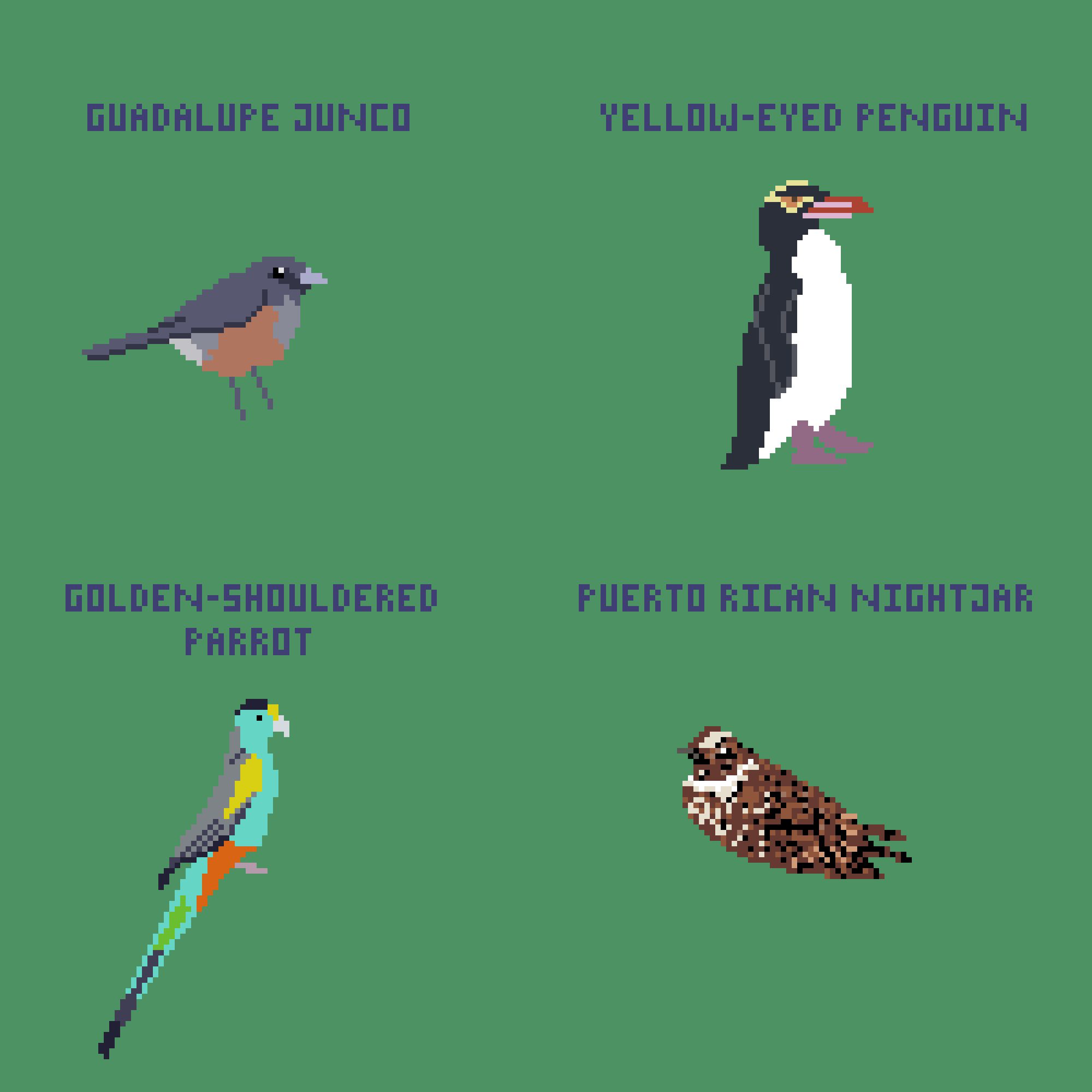 [ID: A series of pixel art depictions of four different birds: the guadalupe junco, the yellow-eyed penguin, the golden-shouldered parrot, and the Puerto Rican nightjar. /ID]